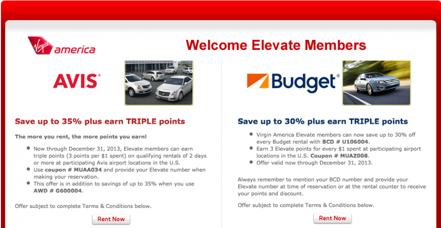 Triple Virgin America Elevate Points and Discounts with Avis and Budget: Now through December 31, 2013, Elevate members can earn 3 points per $1 spent on qualifying rentals of two days or more at Avis airport locations in the US using the coupon code MUAA034 and providing their Elevate number when making the reservation as well as savings up of to 35% with the code AWD G600004. If Budget is your chain, you can earn triple points on qualifying rentals of 2 days or more, at participating Budget airport locations in the US from now through December 31, 2013 as well using code MUAz008, plus save 30% on every Budget rental with BCD U106004. Click here for more details.