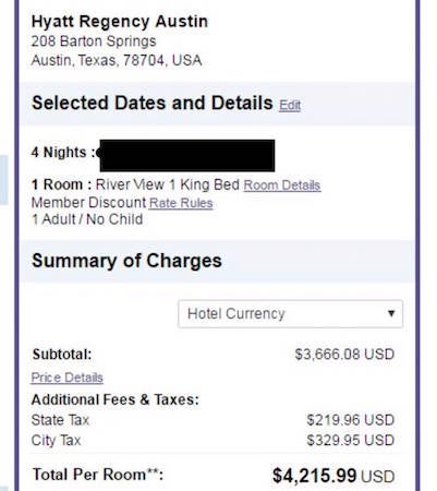 A week later I halfheartedly searched for properties near downtown and was shocked when I saw the Hyatt Regency asking $904 per night! Imagine my further surprise when I found points availability for four consecutive nights over the opening days of SXSW. I booked four nights at 15,000 points apiece for a total of 60,000 points. The same room would have cost me $4,215.99 if I paid out of pocket.