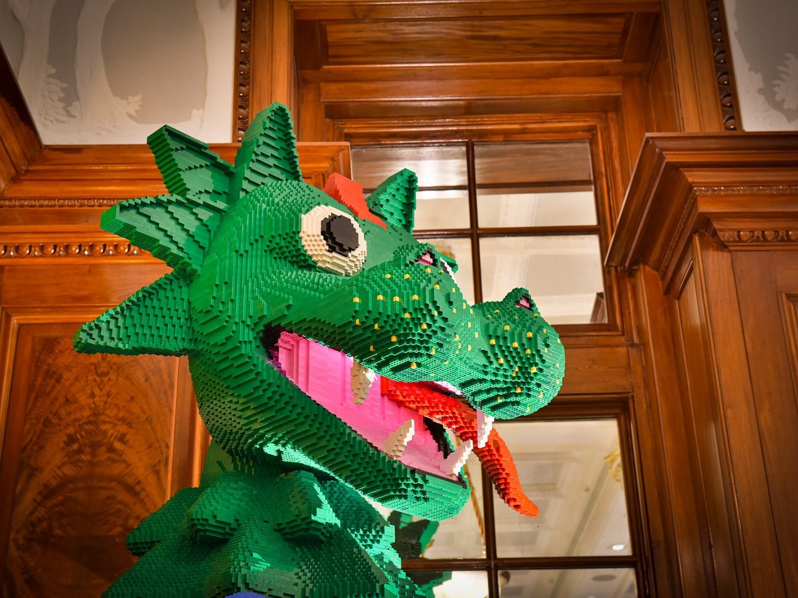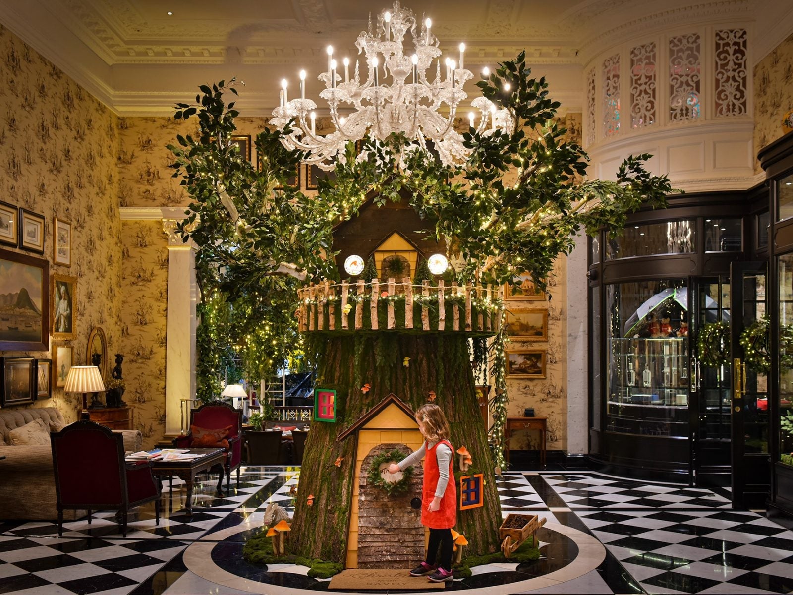 We're talking about a life-sized dragon-shaped Christmas tree and motorcycle fit for Santa. Travel + Leisure reported the magical displays were also installed above the famous Savoy Court sign, as well as the Front Hall. There are 12 rebuilds in all, including a rocket ship-turned-castle; a tea-drinking lion (because, England) and a family of trees hidden inside the great oak treehouse.