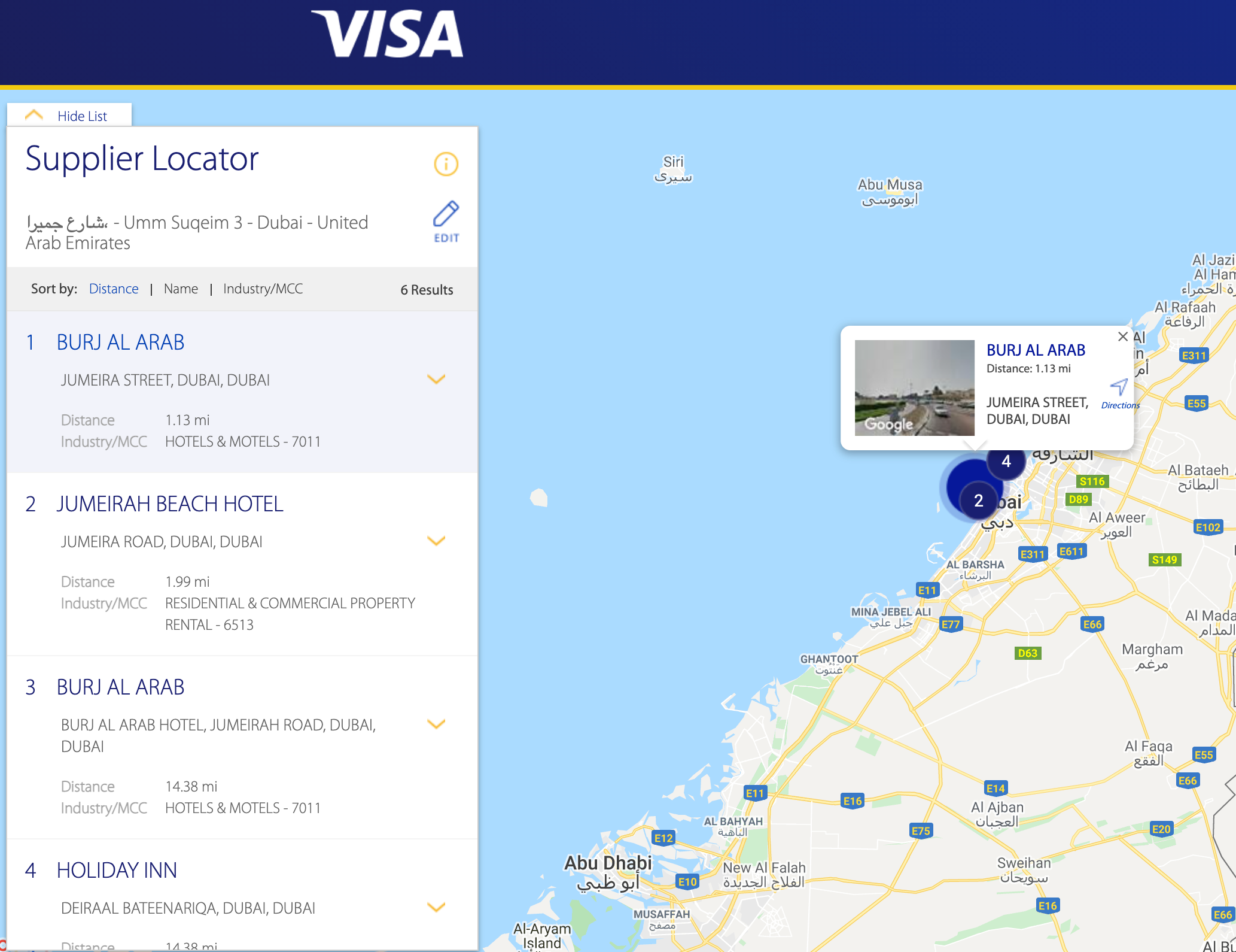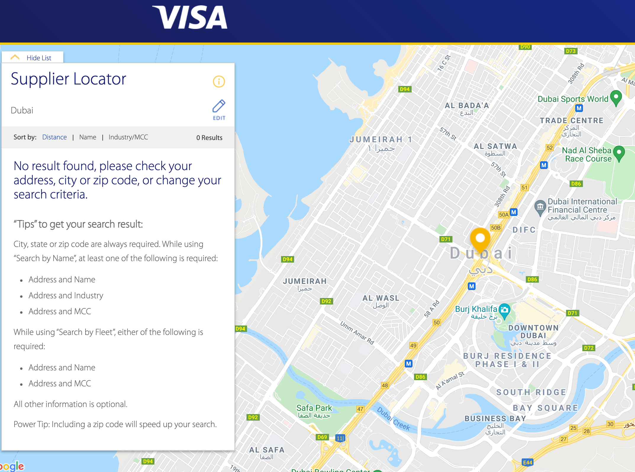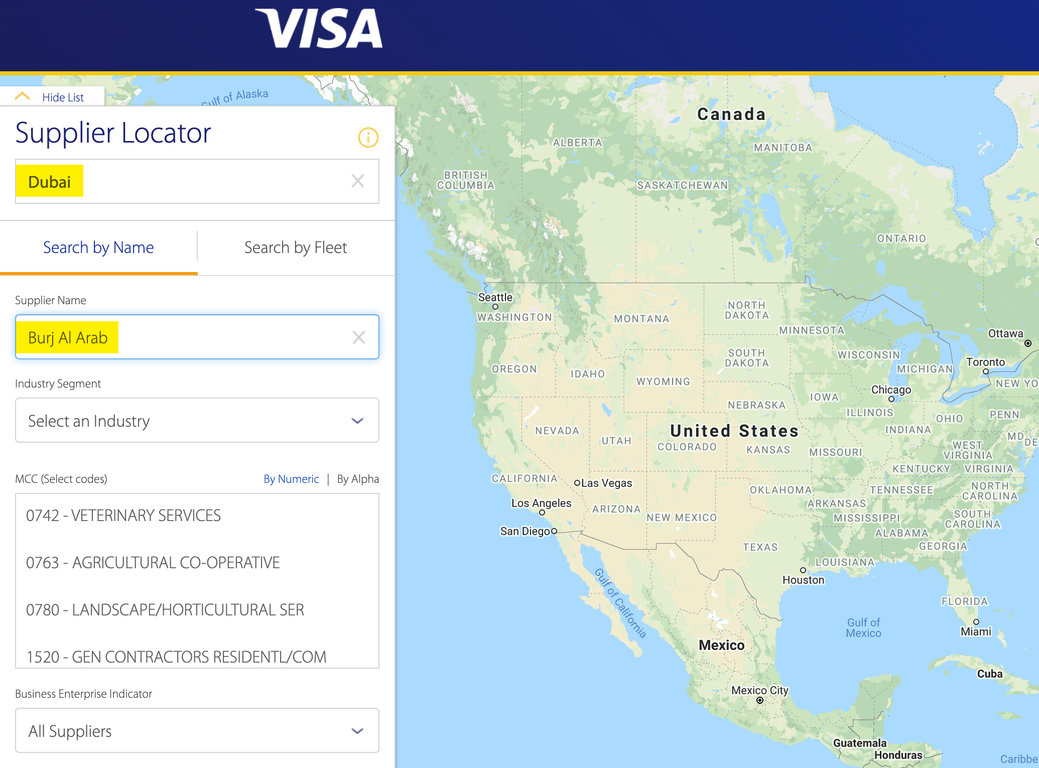 Let's run through my above meal in Dubai. I'll enter the location and hotel into the Visa Supplier Locator.