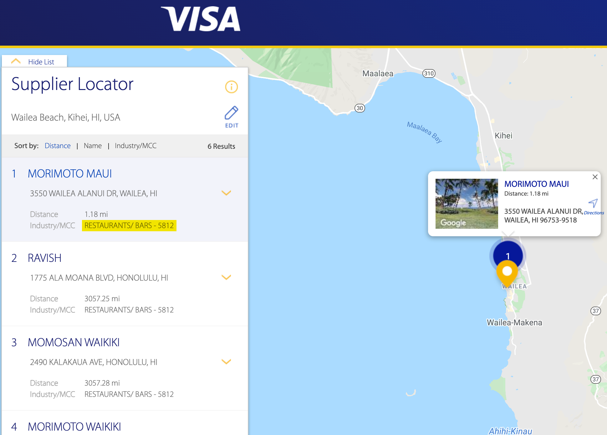 The Andaz Maui possesses a handful of quality dining options. On the premises is Morimoto Maui, an expensive Japanese fusion restaurant. Here it is with the Visa Supplier Locator, coding as "RESTAURANTS/BARS." That's not good. You won't be able to redeem Capital One miles for a meal here.