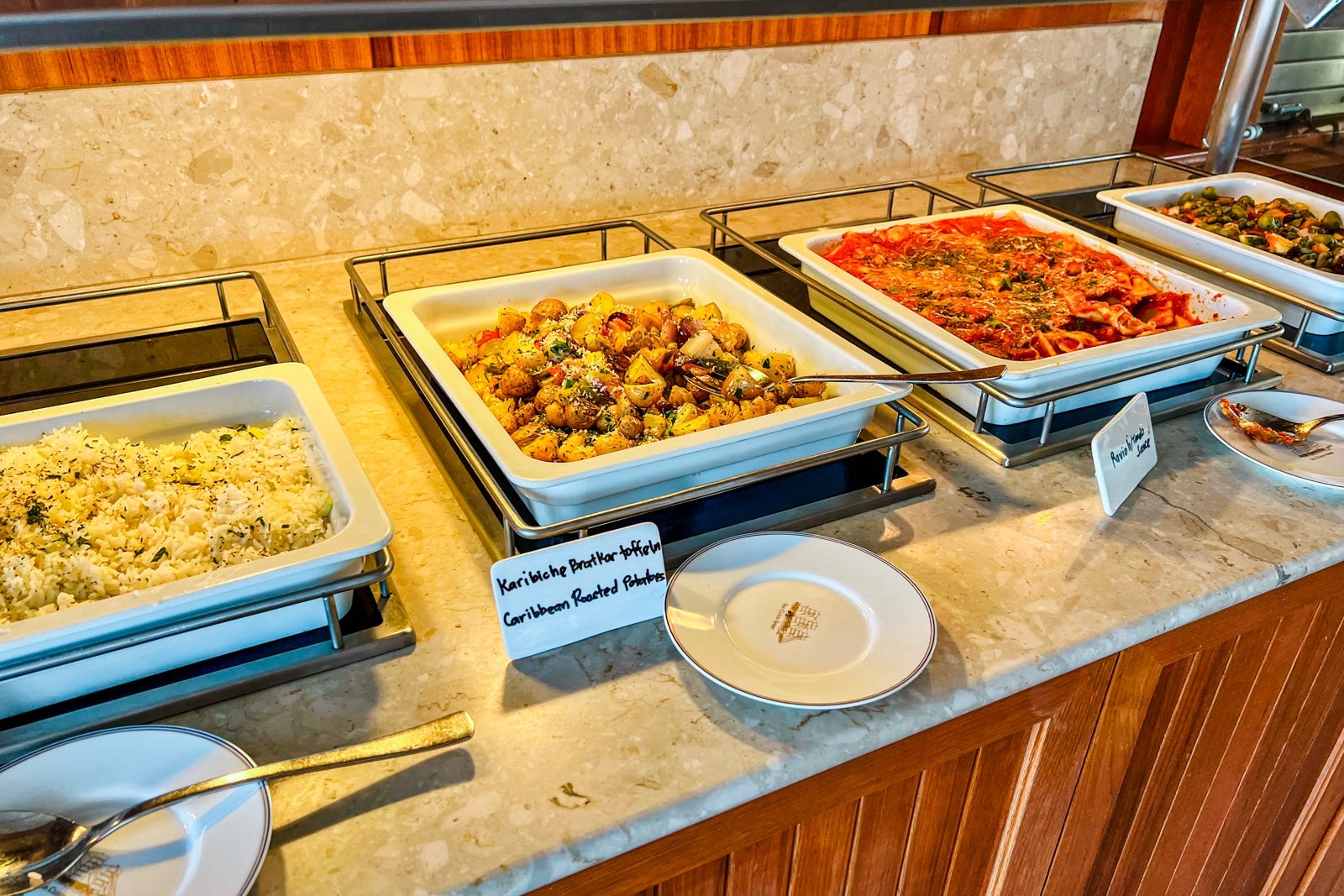 The single option for lunch typically is a buffet served at the outdoor bistro, with breakfast served as a buffet in the Restaurant. On some nights, dinner is also a buffet served at the outdoor bistro, with no meal served in the Restaurant.