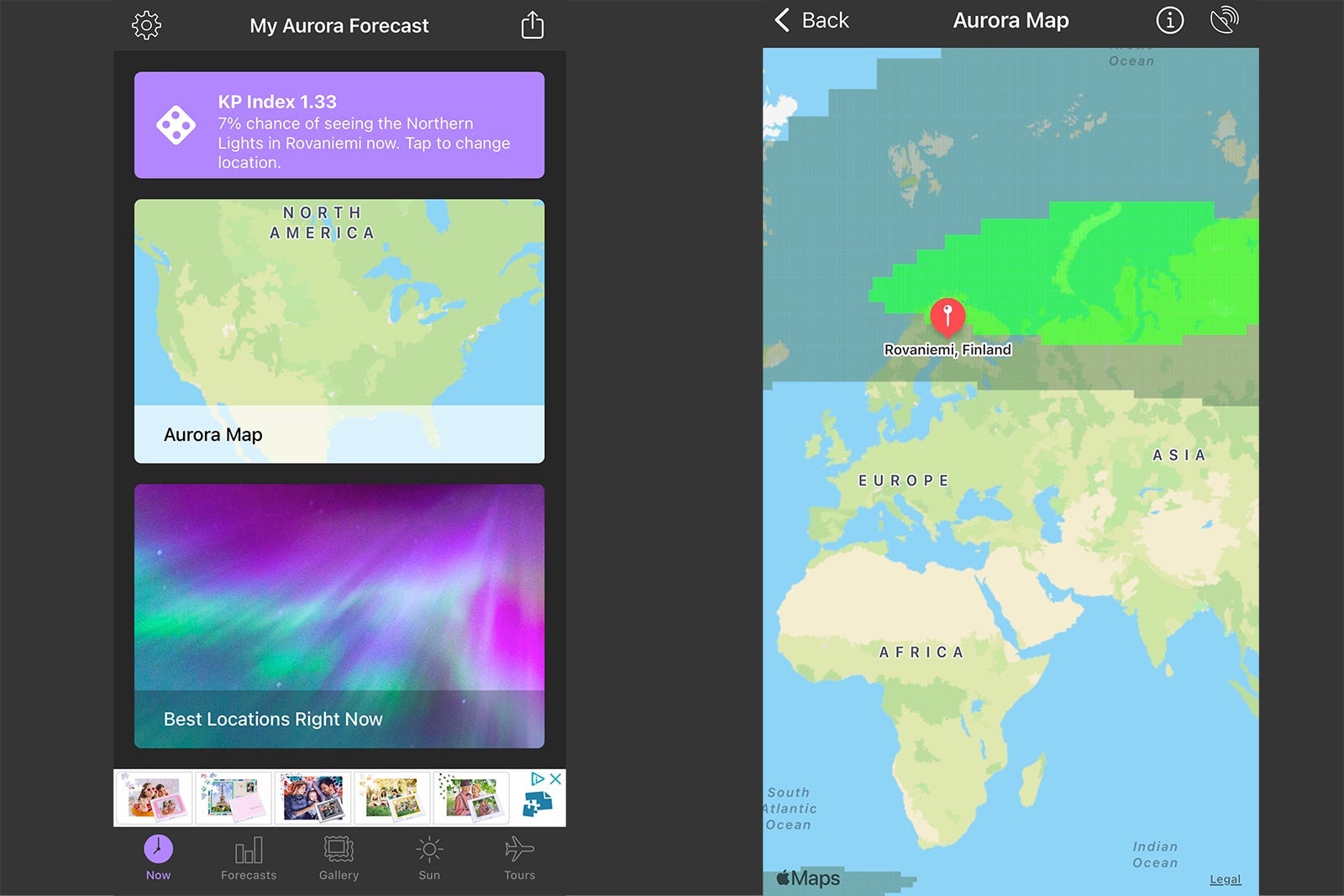 While there are different sites and apps out there to pick from, we used the Aurora app that displays where in the world has the best chance of seeing the lights at that moment, as well as a forecast of your chances to see them in the coming hours and days