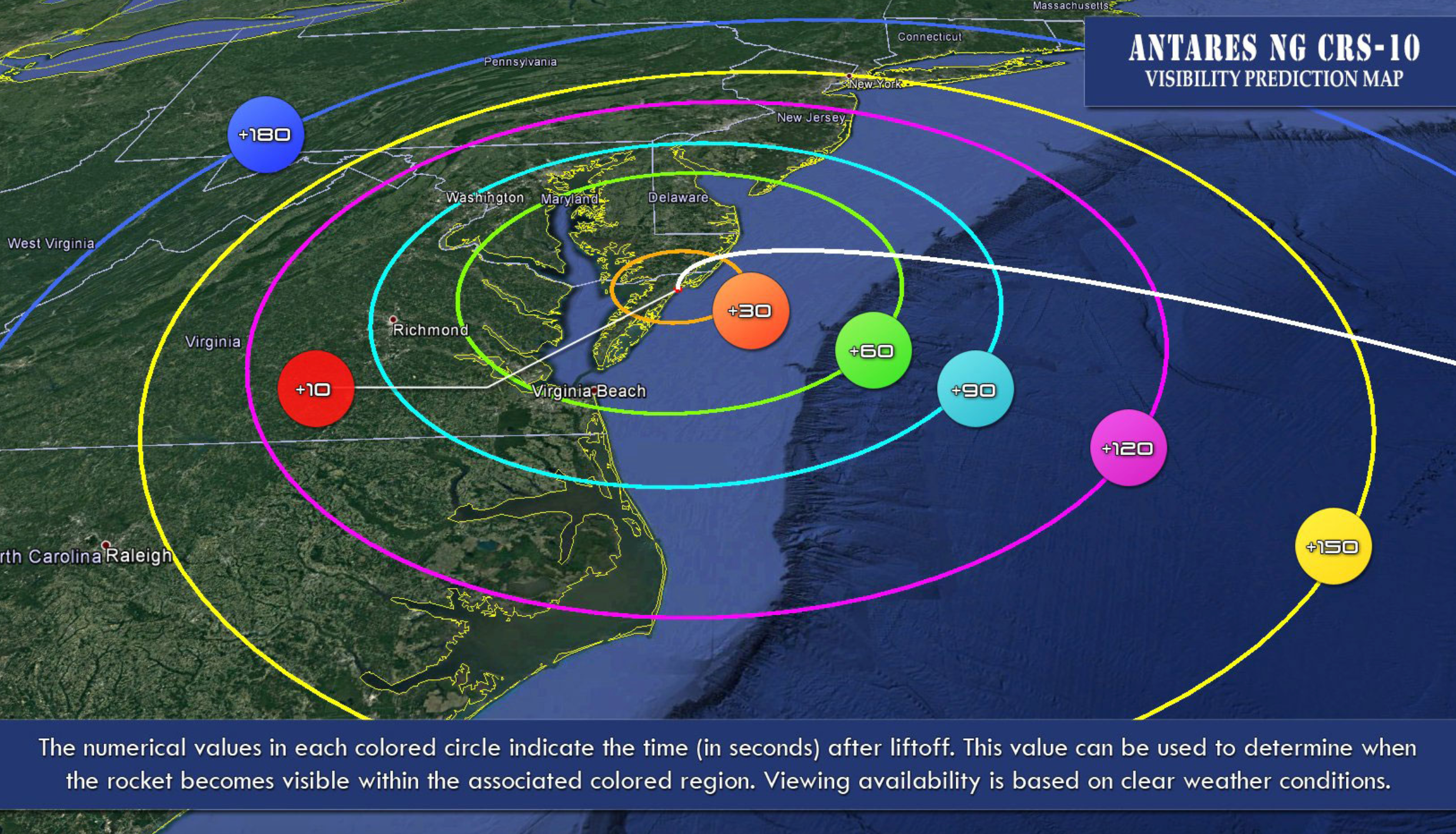 People from Wilmington, North Carolina all the way north to Hartford, Connecticut may be able to spot the rocket as it exits Earth's atmosphere. People in Virginia Beach are projected to see the rocket around 60 seconds after launch. New Yorkers, meanwhile, might notice the rocket barreling toward space 150 seconds after liftoff. All of this, of course, assumes the skies are clear.