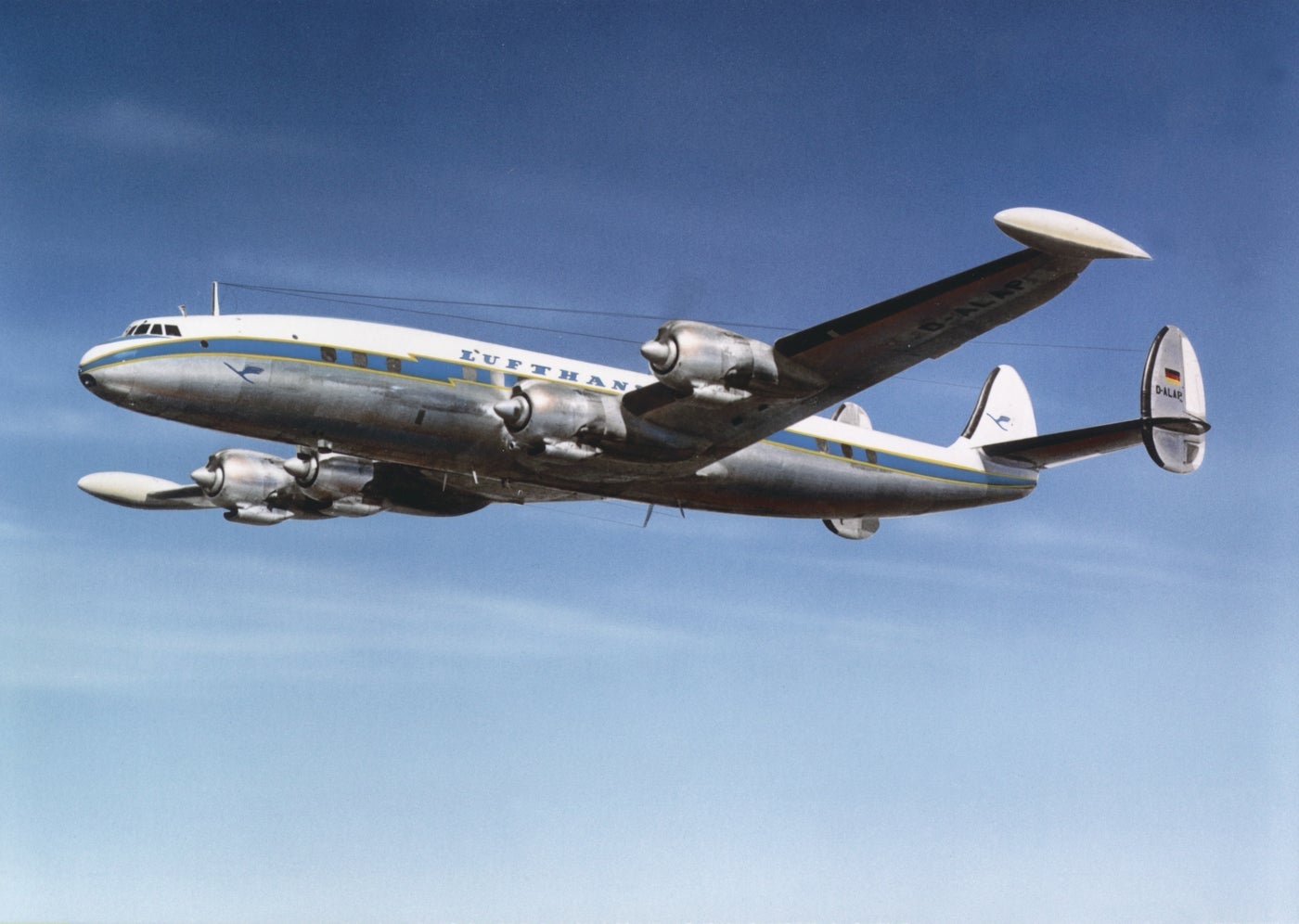 Seen below in the mid-1950s: a Lockheed Super Constellation, used on flights to the US. It was the last of the great piston-engined long-haulers before jets took over. Lufthansa flew it from 1955.