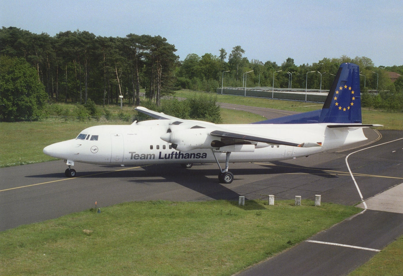 The yellow-over-blue with white fuselage and Helvetica titles became a group identifier for regional airlines operating under Lufthansa's umbrella as Team Lufthansa — for example, as seen on this Fokker 50 regional turboprop.