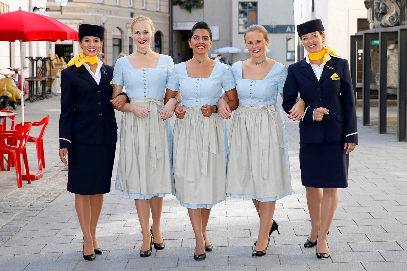 Yellow and blue was also the main color of flight attendants' uniforms, for example here in Munich in 2015. That's also when Lufthansa celebrated its 60th anniversary by introducing a special light-blue uniform inspired by the traditional Dirndl dress.