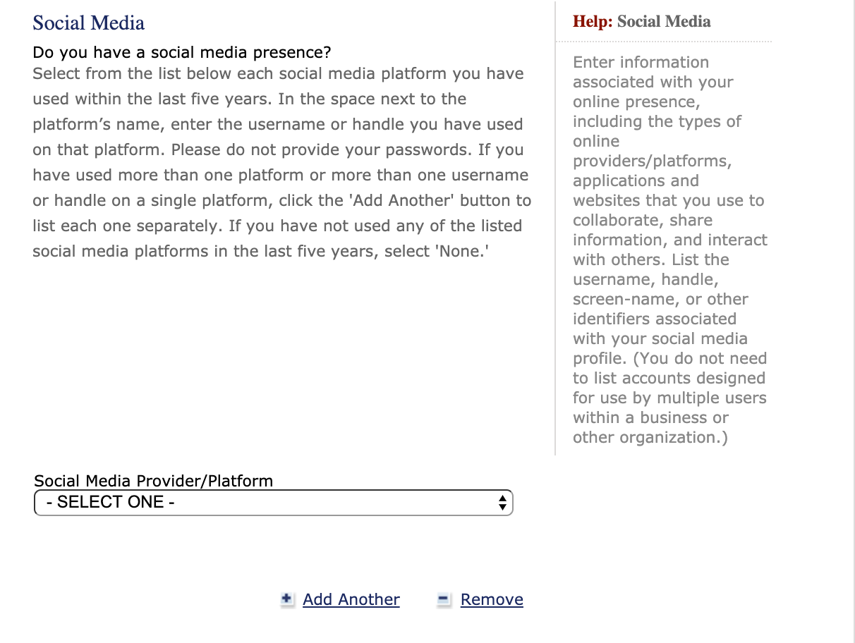 The form allows for applicants to add multiple accounts from multiple social media platforms including Instagram, Facebook, Twitter, Reddit and Youtube. For the select group of you still hanging out with Tom over on MySpace, the US government wants to know about that too.