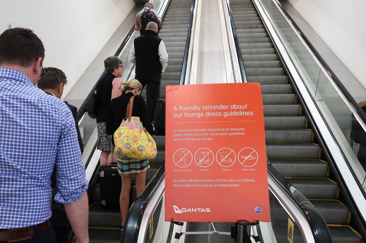 The airline helpfully puts this reminder about its lounge dress code at the priority check-in desk in Sydney's Terminal 3. That way, if you're wearing improper clothing, you can presumably pull different clothes from your bag before checking it.