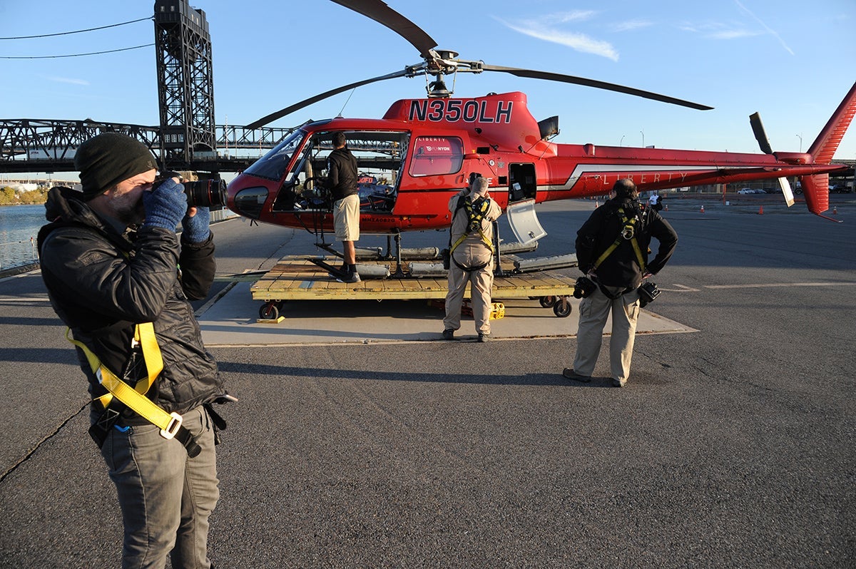 After a safety briefing in a beautiful industrial loft, you're helped into the harness that will keep you strapped to the helicopter; your gear is then hooked to the harness and you are driven out to the helipad.