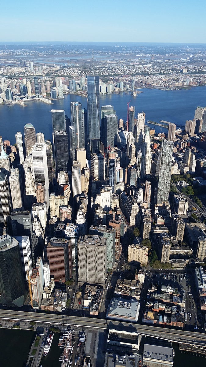 Obviously, this flight is not a good idea if you suffer from vertigo. And with the bright morning sun glaring in our face, the images looking east were backlit, but when we turned west, One World Trade Center shone gloriously at us. It's also a good marker of altitude; the tower is 1,776 feet, so you need only look at it to judge your height.