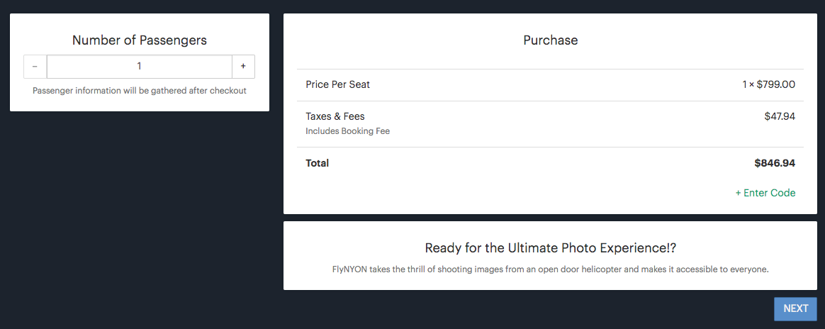Booking online is a snap. One caveat: It's not cheap. I paid $846.94 with tax, plus $80 in Lyft rides from Brooklyn to the FlyNYON facility and back (it's nowhere near convenient public transit). Flights that don't include airport overflights are less expensive. I paid using my new Citi Prestige card; the cost of the flight went toward meeting the sign-up bonus offer of 75,000 ThankYou points after you spend $7,500 within the first three months of account opening. Normally I'd use the Chase Sapphire Reserve, which offers 3x points on travel.