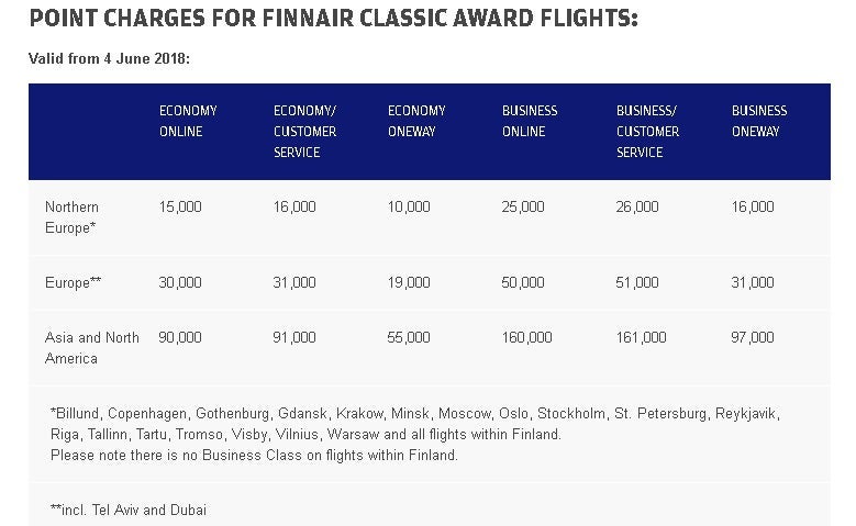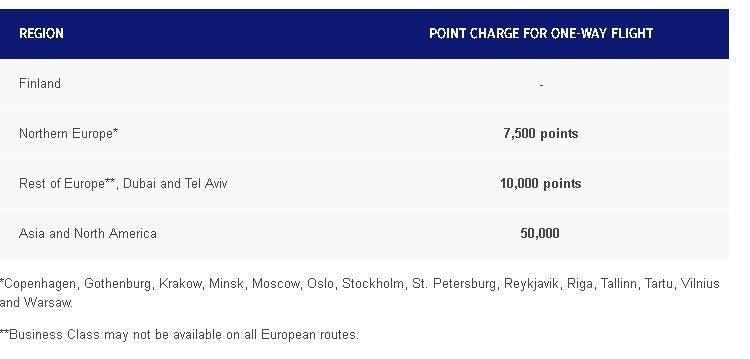 Here too, there's little value to be had. For example, round-trip award flight of up to 6,000km (3,728 miles) are 60,000 Finnair miles in economy class and 100,000 in business class. This is a tremendous amount of miles for a relatively short distance, about the equivalent of a round-trip flight between Chicago and San Francisco. And remember, you can only redeem these awards for itineraries that contain flights operated by two or more partners.
