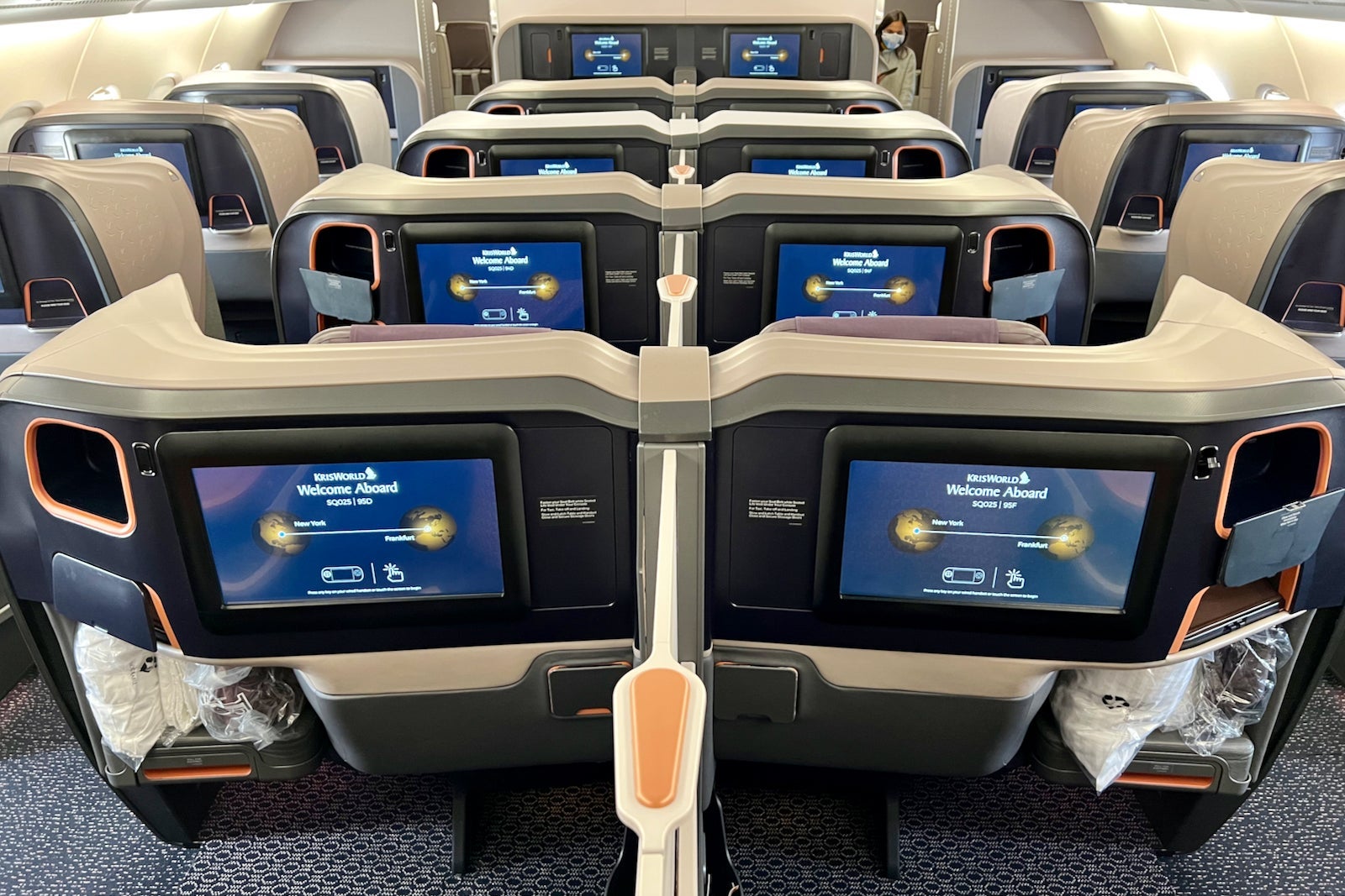 The nonstop flights from Singapore to New York are operated by the ULR, or ultra-long-range, variant of the A350, which Singapore outfits in a two-cabin configuration. In addition to 67 business pods, there are 94 premium economy recliners on this plane.