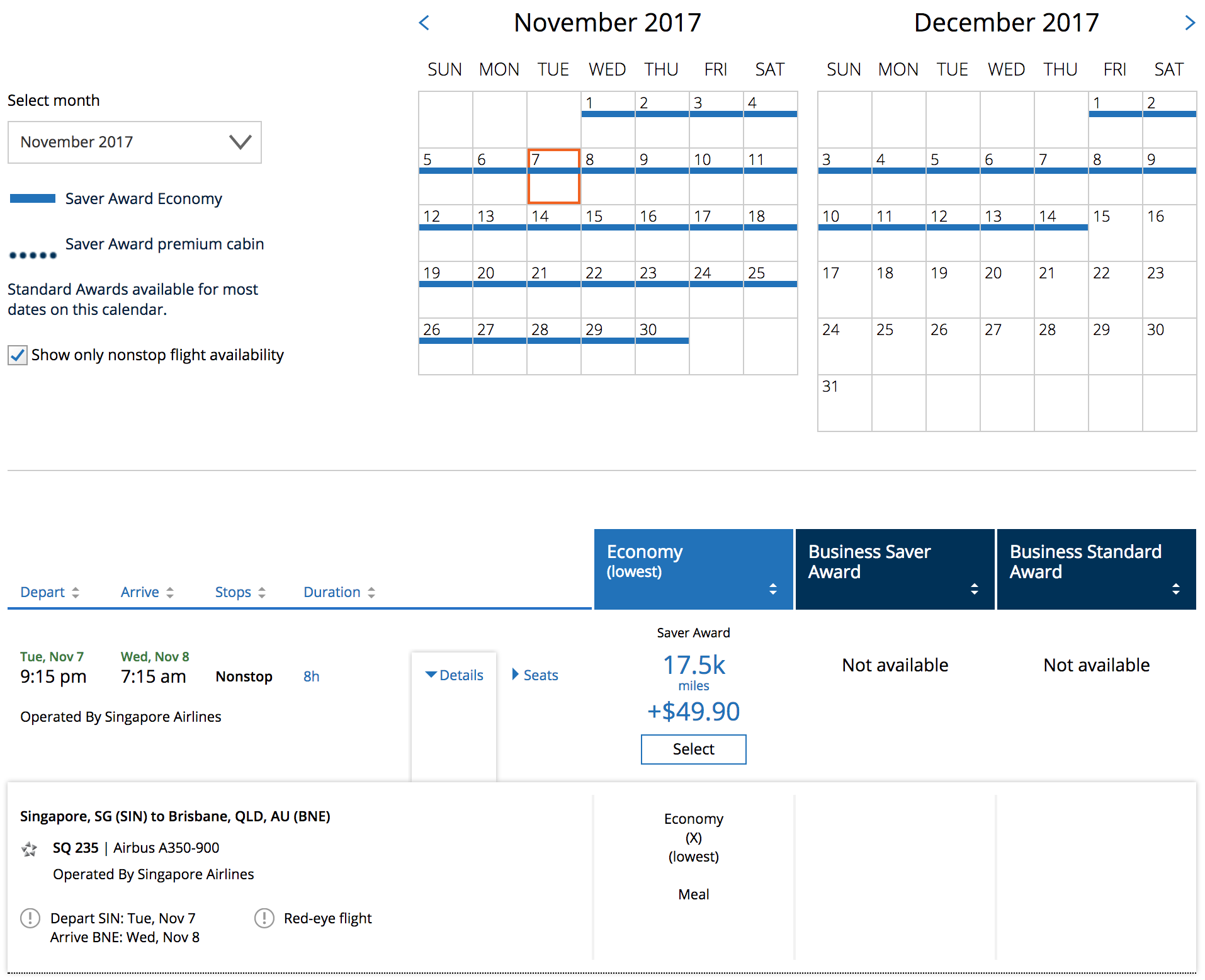 There was one exception to this rule, however — Singapore was making business class awards on its new A350 available to partners specifically for flights between SIN and some destinations in Australia. And, that availability was fantastic, as you can see in this October 3 screenshot: