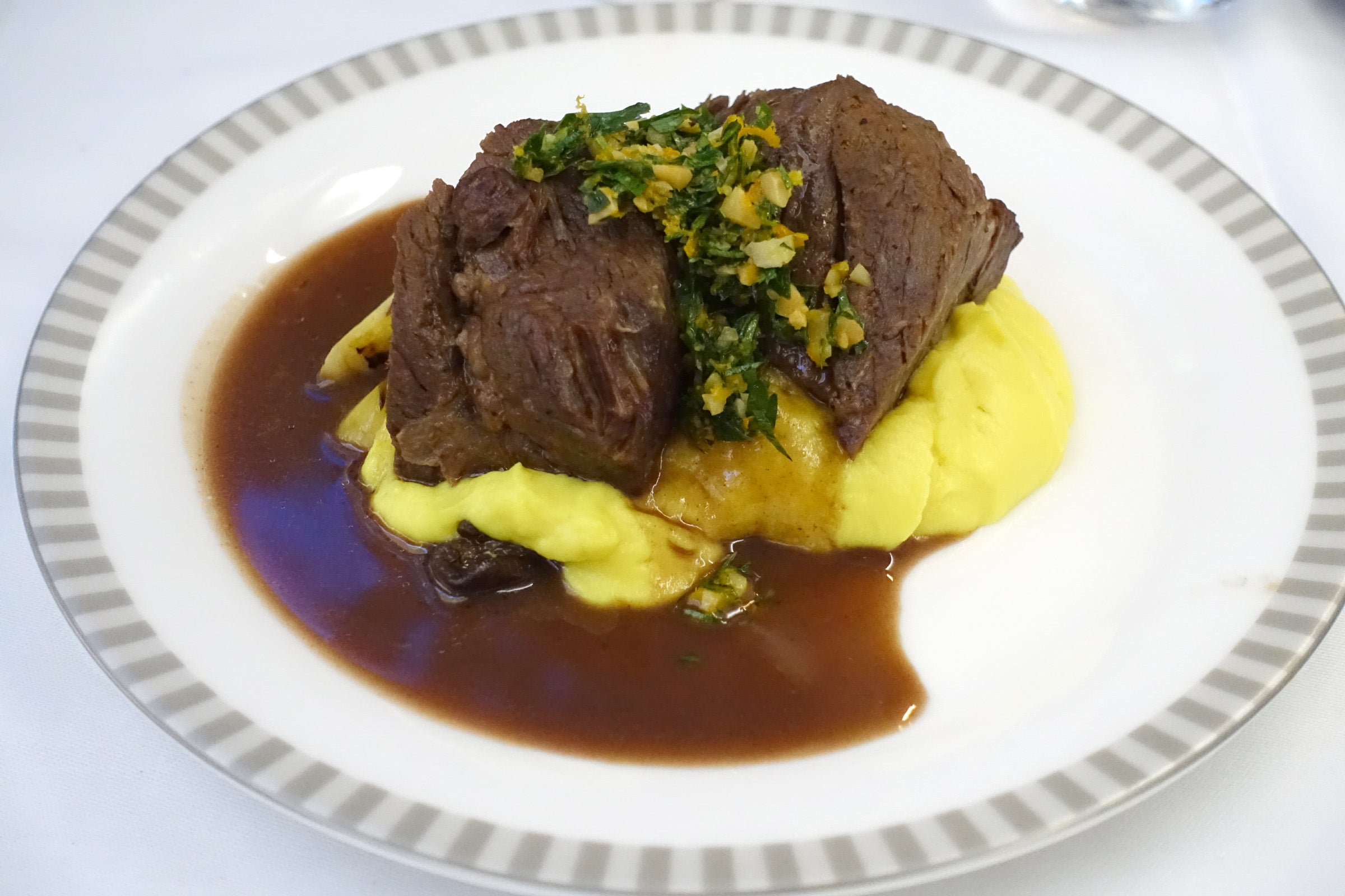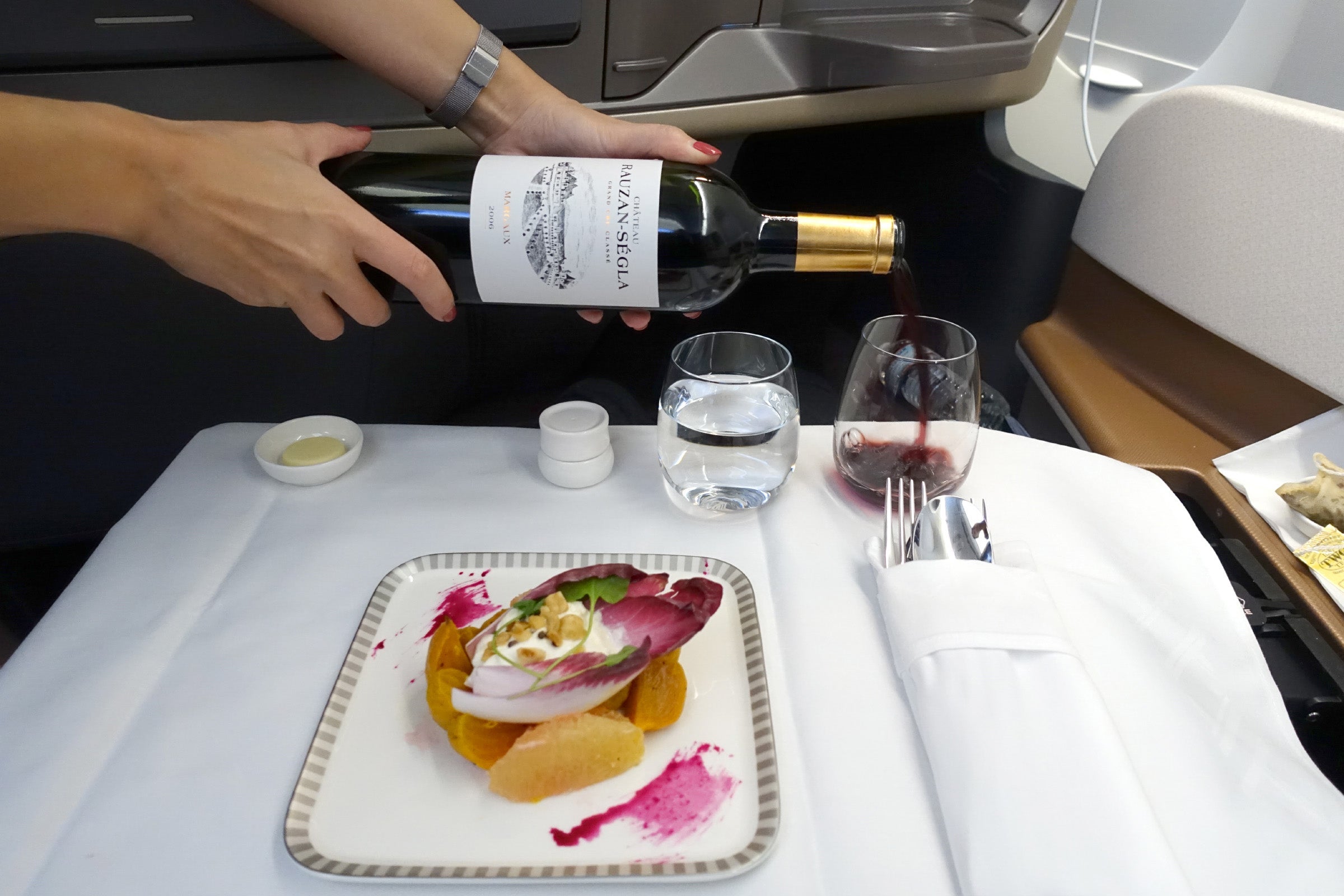 I started with the roasted beets with burrata, with 221 calories, 20 grams of carbs, 10 grams of protein, 12 grams of fat and 428 milligrams of sodium, an important stat to track to avoid retaining too much water on a long flight. While calories weren't listed for my beverage pick, I paired the appetizer with SQ's special Bordeaux, a phenomenal 2006 Chateau Rauzan-Segla (about $80 a bottle), available only on SQ21 and SQ22 for the next 30 days.