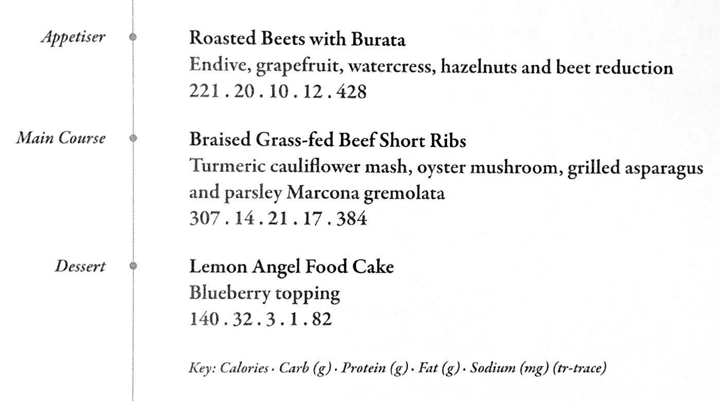 The entree consisted of braised grass-fed beef short ribs, with a turmeric cauliflower mash, mushrooms and asparagus — 307 calories, 14 grams of carbs, 21 grams of protein, 17 grams of fat and 384 mg of sodium.