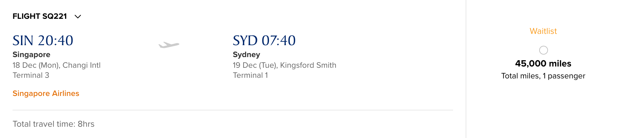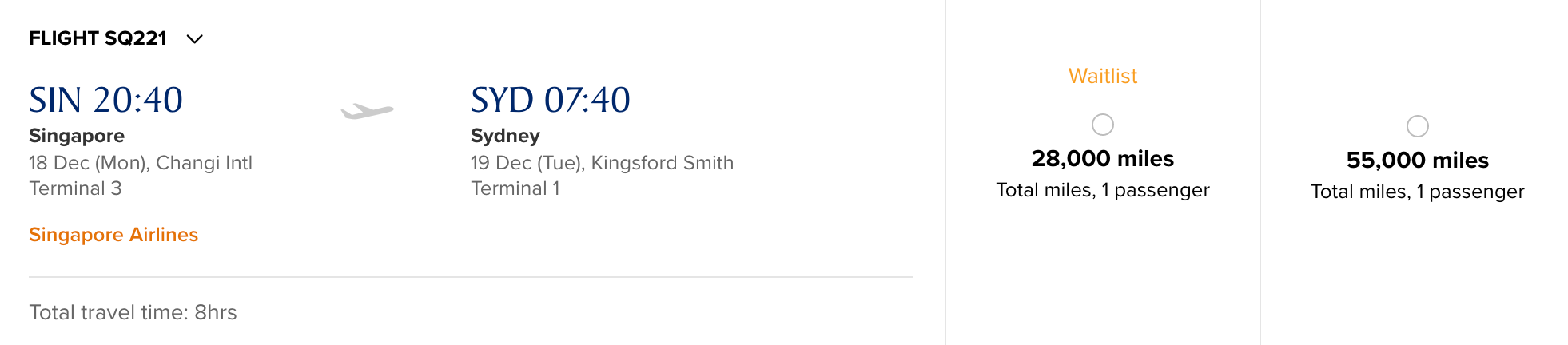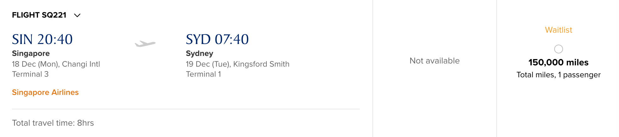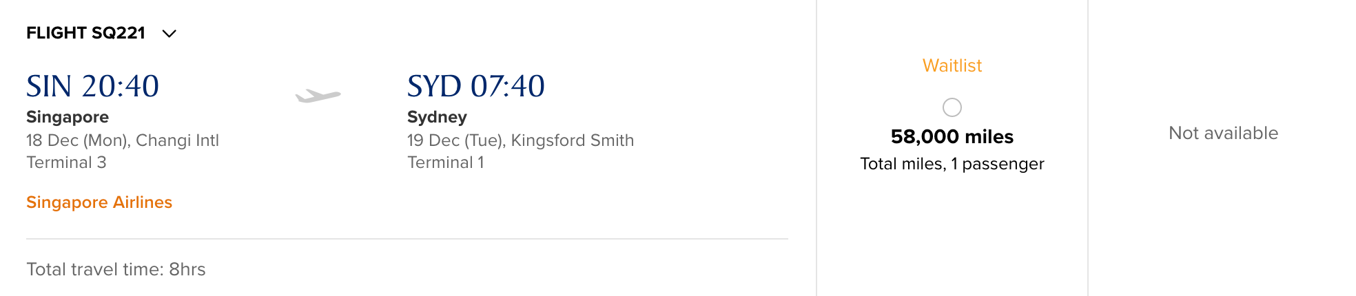 However, there is waitlist saver availability in business class. Of course, waitlist isn't guaranteed. But, if you can get it at the saver level, it'll cost you 58,000 KrisFlyer miles one-way. On the return flight (SYD-SIN), there is only waitlist standard availability for 90,000 KrisFlyer miles.