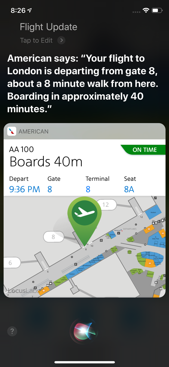 Now if we could just get Siri to tell us which TSA check point has the shortest line or what black hole our lost luggage disappeared into, that would be really helpful.