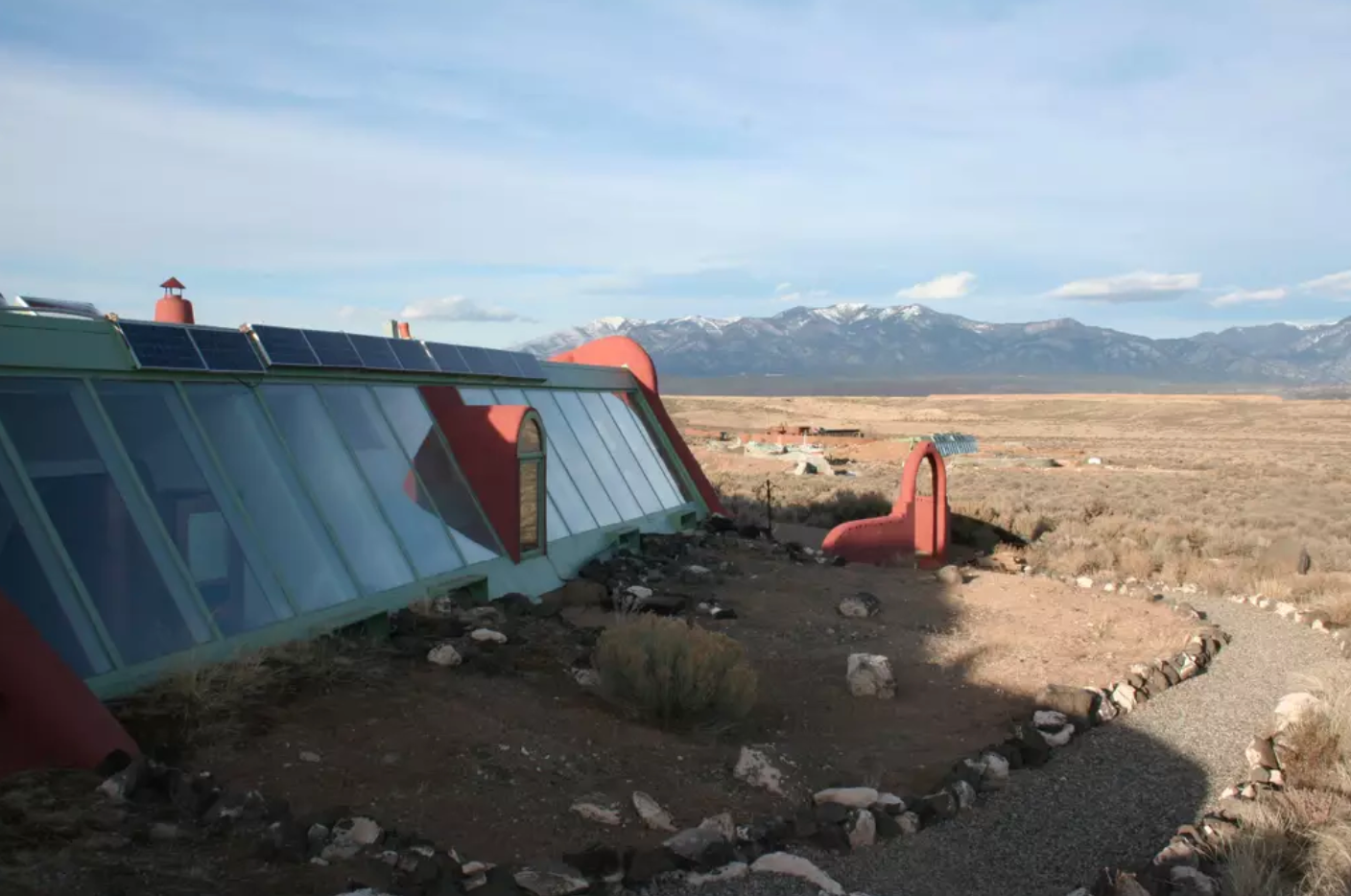 The whole draw of an Earthship is how dependent it is on the natural elements. According to Earthship Biotecture (an architecture group led by Michael Reynolds that has been building these homes in Taos for years) to be an official Earthship, the home needs to check a couple of boxes: It must produce its own electricity, and provide water from natural sources. It must have an on-site sewage system and use passive heating and cooling. Food should be produced nearby, and the Earthship should be built with readily-available materials.