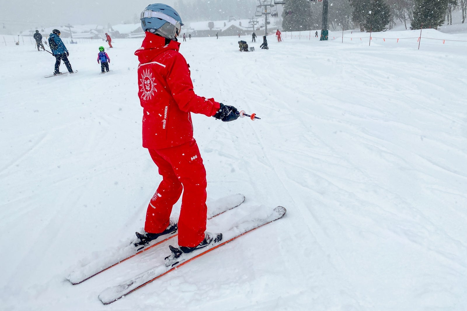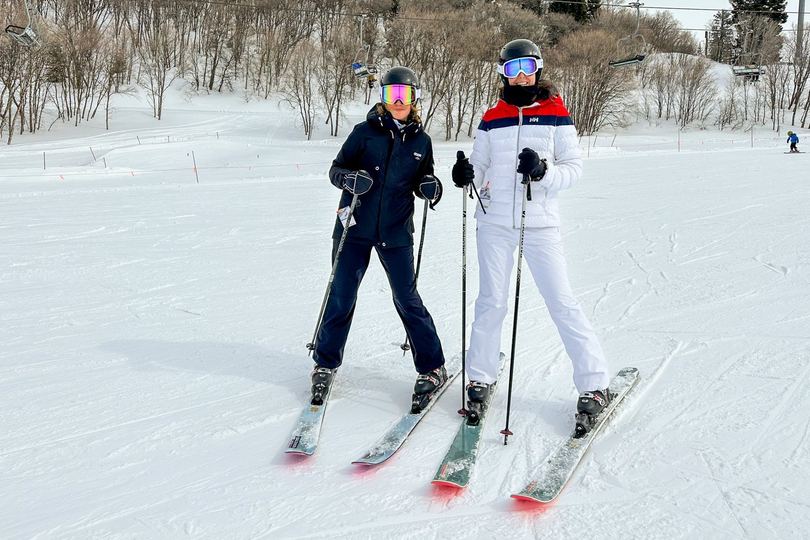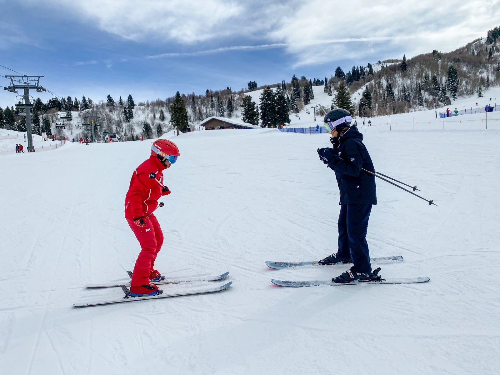 My friend and I spent most of our first lesson on Littlecat, Snowbasin's beginner-friendly bunny hill lift. Tomoko Shimbo — our instructor, a professional speed skier originally from Tokyo — patiently assessed our skill level, focusing primarily on mastering wedge versus parallel stance and wide turns.