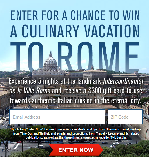 Win A Culinary Trip To Rome: @Travel+Leisure tweets about a contest co-sponsored by themselves, plus TimeOut, Thrillist and Shermans Travel where you can win a culinary vacation to Rome. The prize trip includes a 5-night stay for two (including breakfast) at the historic Intercontinental de la Ville Roma located near the Spanish Steps, roundtrip airfare for two to Rome, 2 Time Out Rome City Guides, $300 to spend on meals, and a Rome restaurant guide compiled by ShermansTravel experts. You have until March 15, 2014 at 11:59 PM EST to enter.