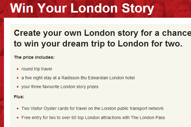 Win a London Trip: @VisitLondon tweeted out a contest yesterday where you can win a trip to London. The prize includes roundtrip travel, five nights at the Radisson Blu Edwardian, three small London-themed prizes, two Oyster transportation cards and two London Passes with free entry to museums and attractions. You enter by looking at videos and stories by Londoners, choosing your three favorites and constructing an itinerary based on them. It takes just a couple minutes. Submit your entry by March 2, 2014.