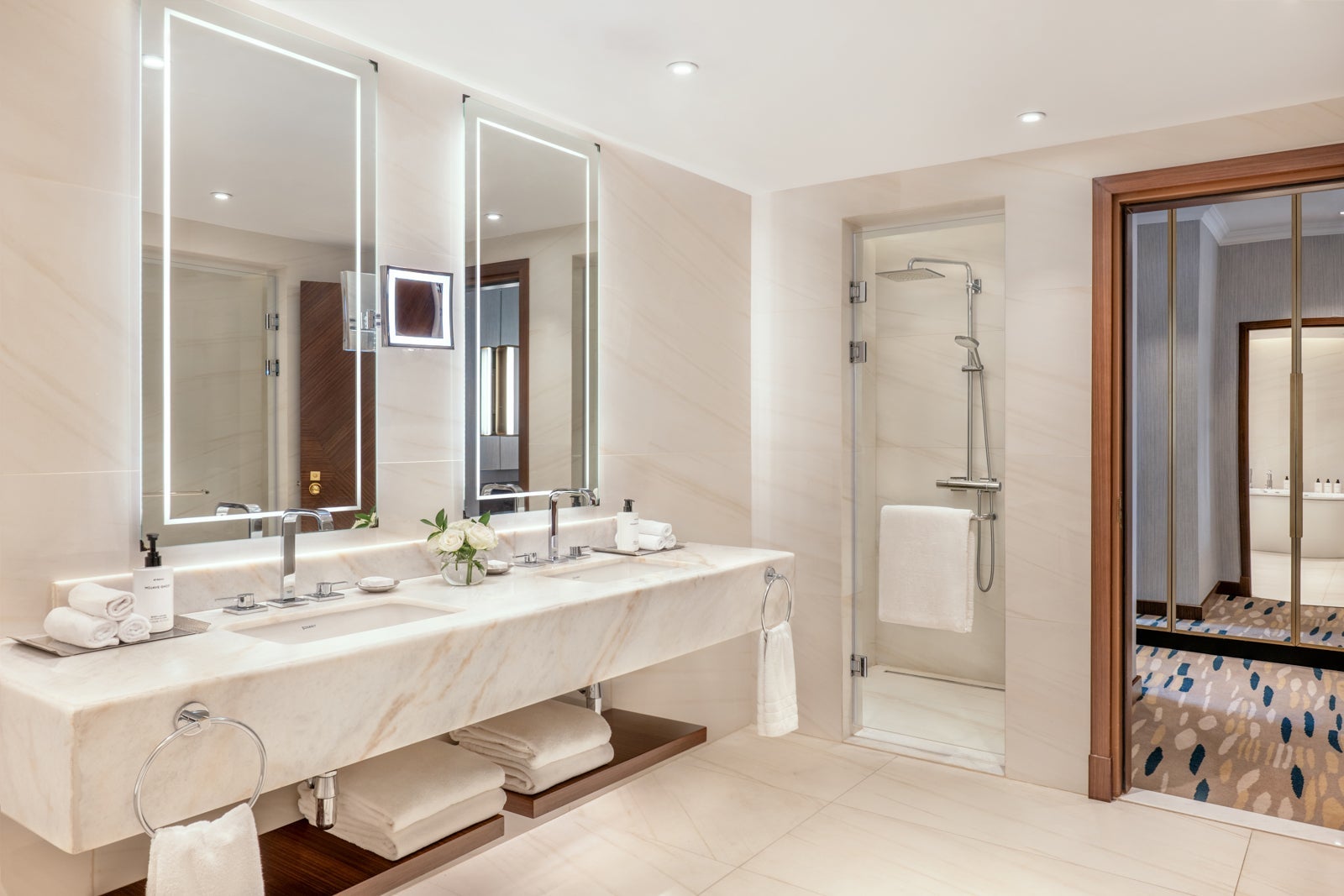 The hotel is spread out across 24 floors and features plenty of space; rooms start at more than 440 square feet and are decorated with calming blue tones and rich wood accents. Each stay comes complete with an indulgent soaking tub and rainfall shower along with aromatherapy amenities to elevate the experience. But guests staying in the suites will be able to take their experience to the next level thanks to a 24-hour butler service and access to the exclusive Club Millesime, which welcomes guests with everything from complimentary breakfast to cocktails and canapes at night.