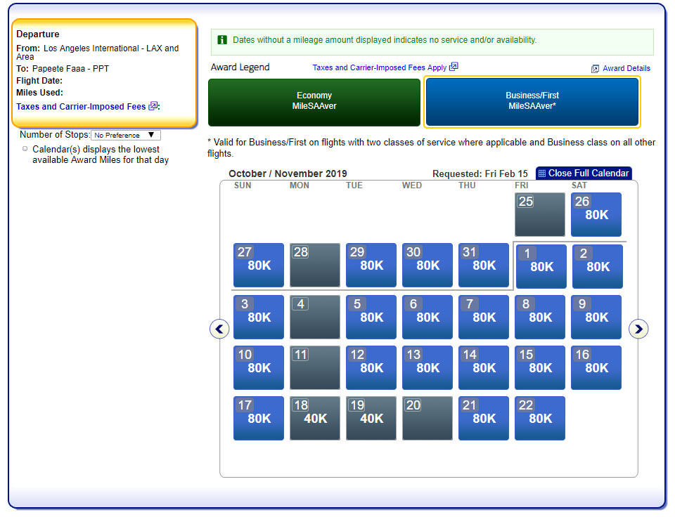 Here are the dates that I'm currently seeing business class award availability for two passengers from Los Angeles to Papeete, Tahiti: