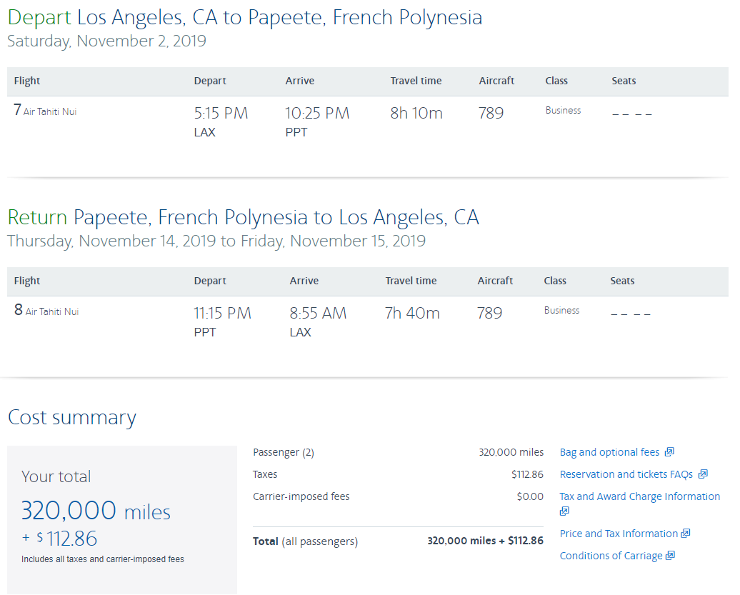 And to be sure that this wasn't phantom award availability, we priced out a few dates to find that the all-in round-trip price for two passengers would be 320,000 miles plus just $113 in taxes/fees: