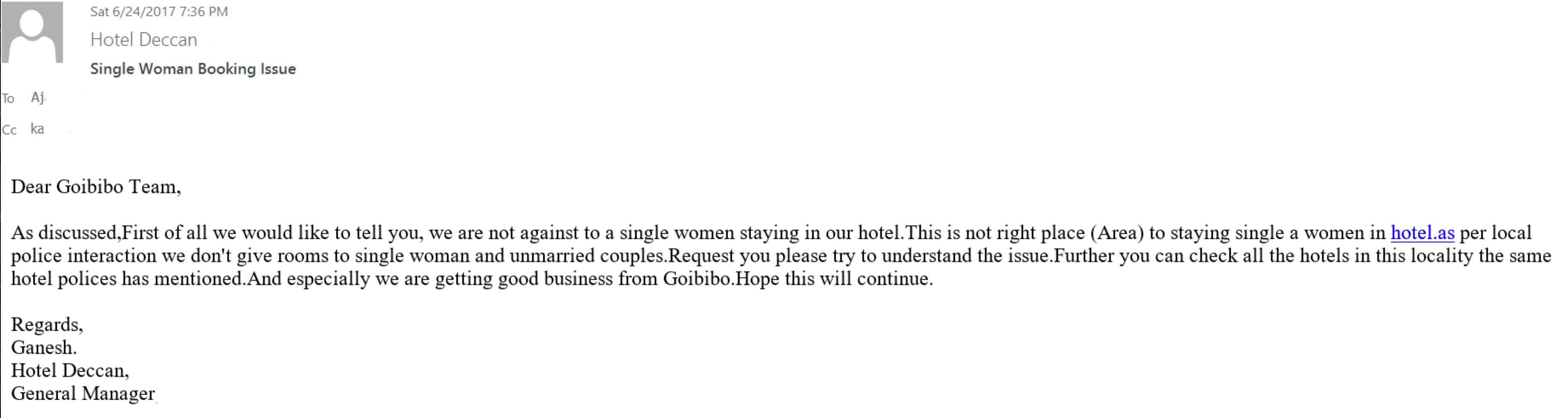 For their part, the hotel claims it doesn't have a problem with solo female travelers, but told Goibibo in a statement that "this is not the right place (area)" for a single woman to stay, "per local police interaction." You can read the full statement from the hotel manager, below.