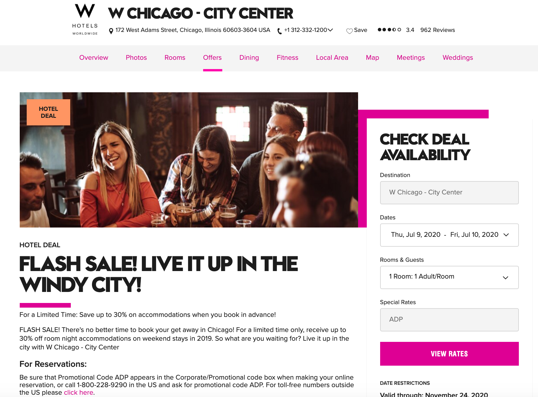 Chicago is home to two W Hotels, one along the lake and a recently renovated property in the center of the city just a few blocks west of Millenium Park. The W Chicago City Center is offering 30% off eligible rates through November 24, 2020 using promo code ADP. You can also search directly at this link.