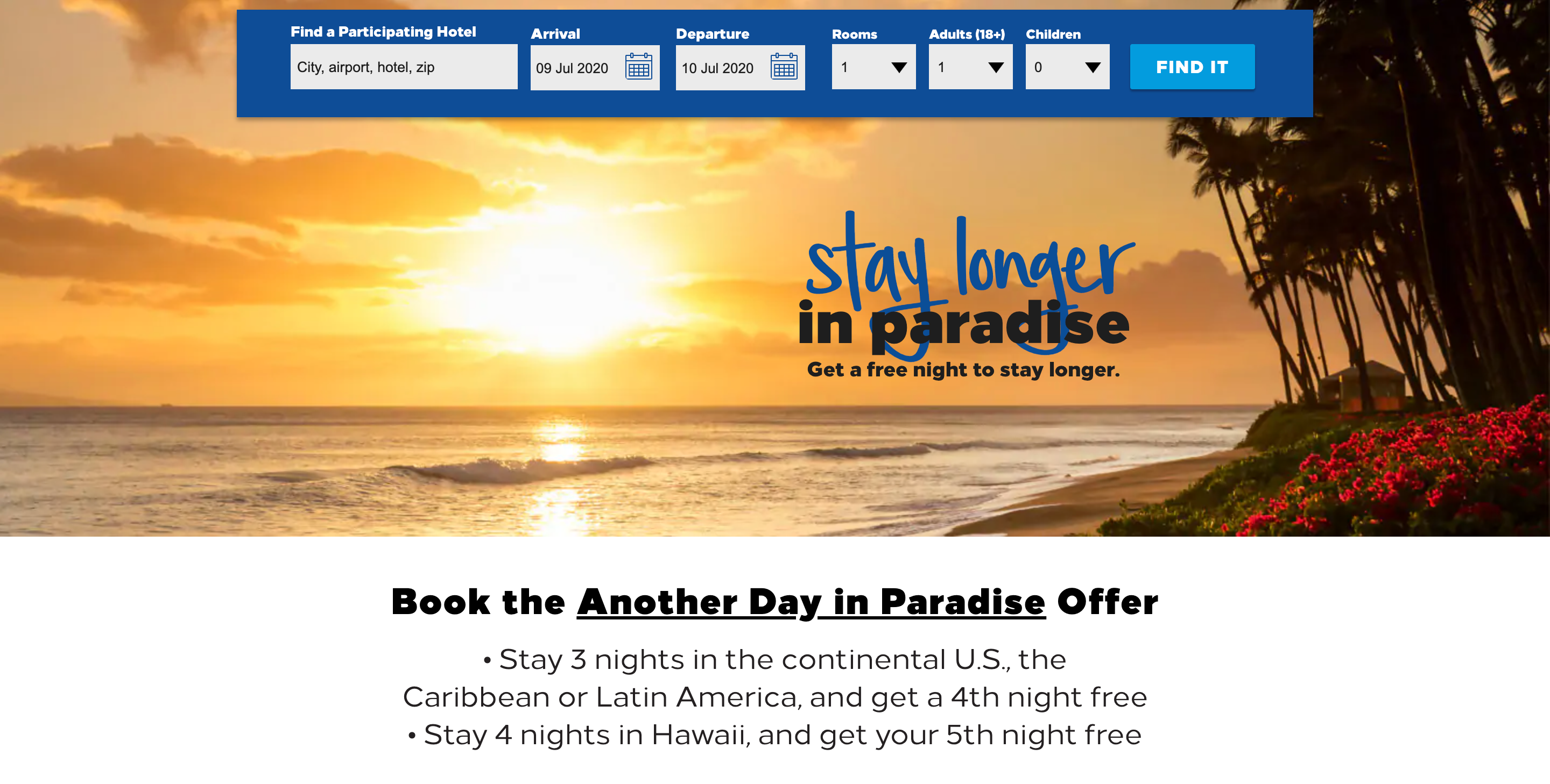 This promotion is valid at most Hilton resort properties, just look out for the "Another day in paradise" text when searching for hotels to make sure your dates are valid.