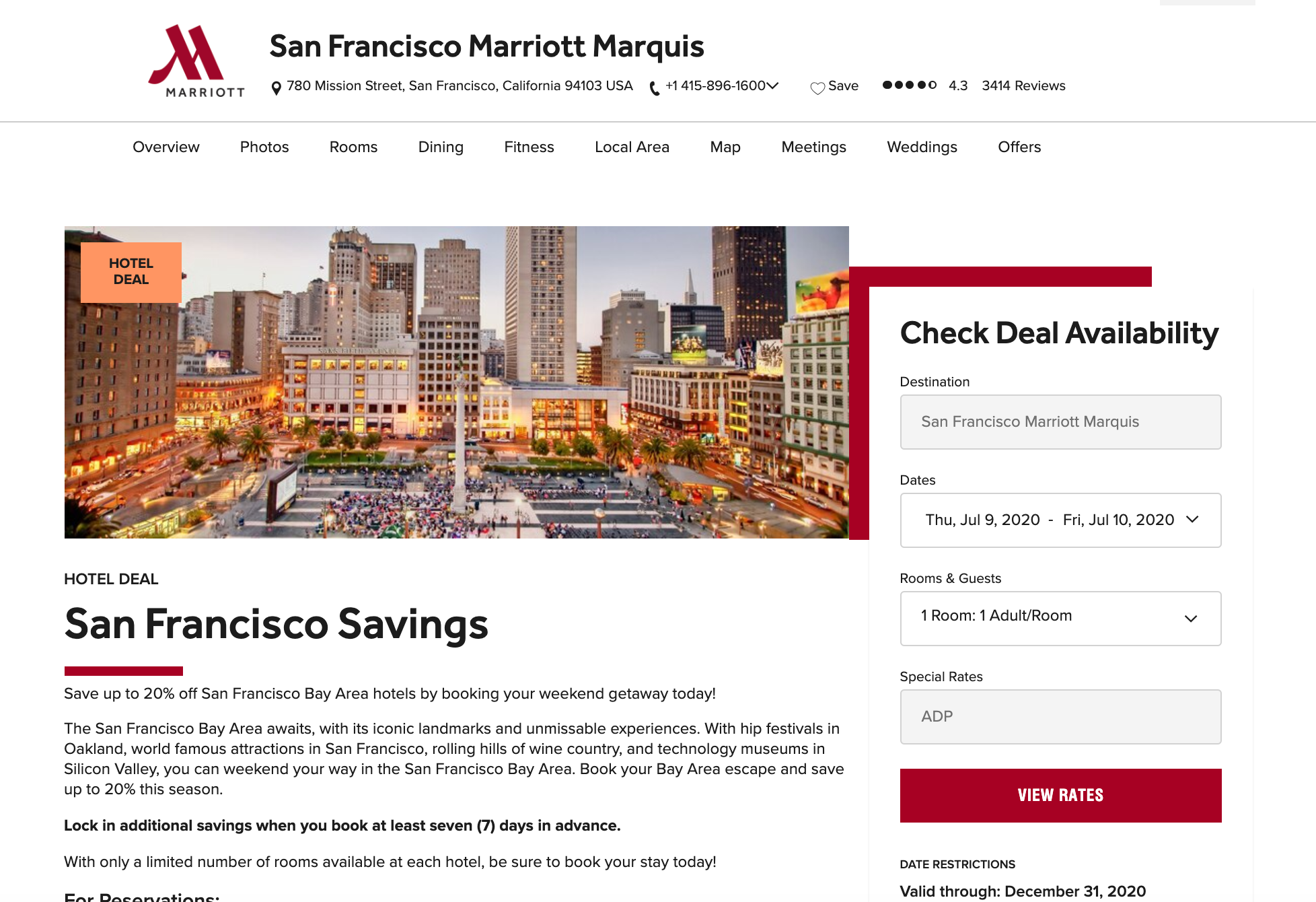 The San Francisco Marrriott Marquis is offering a 20% discount on weekend stays, which it defines as Thursday to Sunday night (inclusive). You can search for eligible rates directly at this link, or use promo code ADP when searching on the Marriott website.