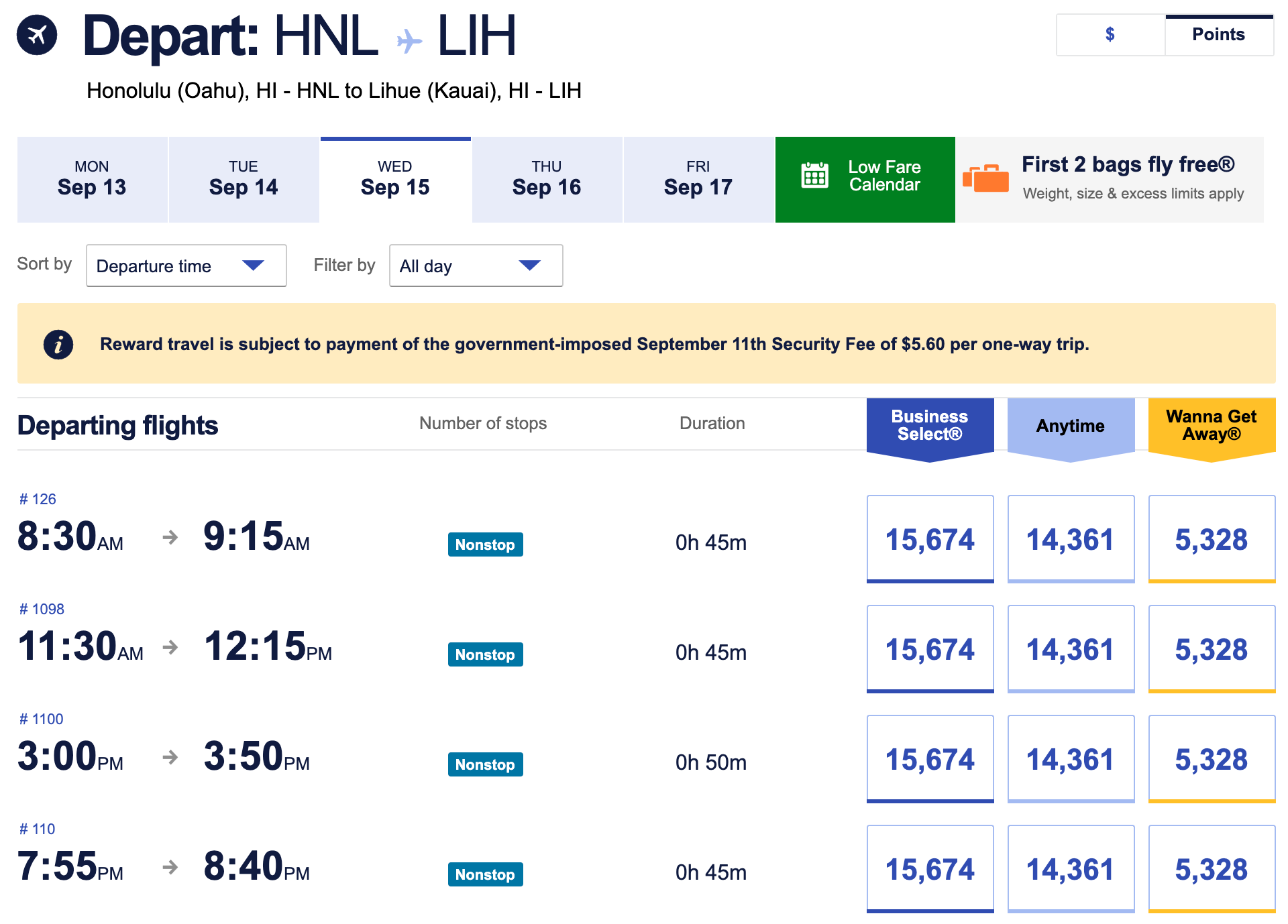 For example, below is a search I completed on Tuesday, from Honolulu (HNL) to Kauai (LIH), with awards starting at 5,007 points.