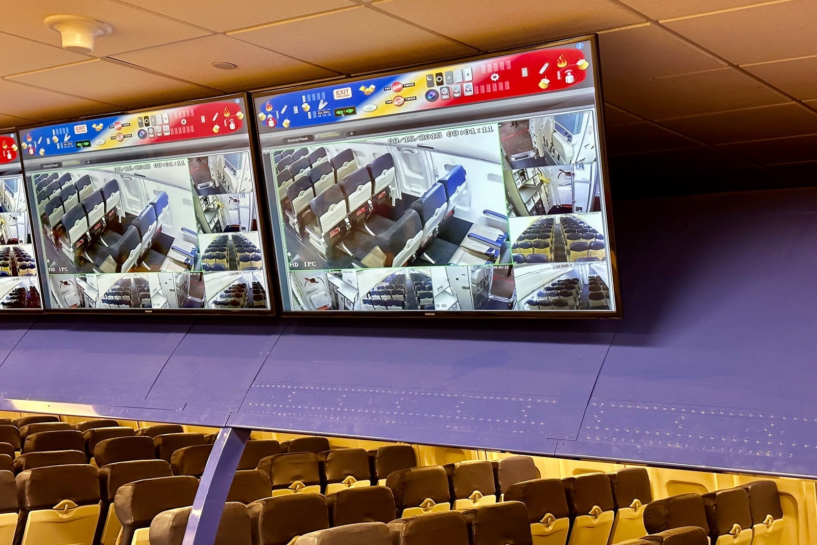 This emergency preparedness center is outfitted with another cross-section of a plane, but this one can simulate many types of inflight emergencies ranging from fires to water landings to smoke in the cabin.