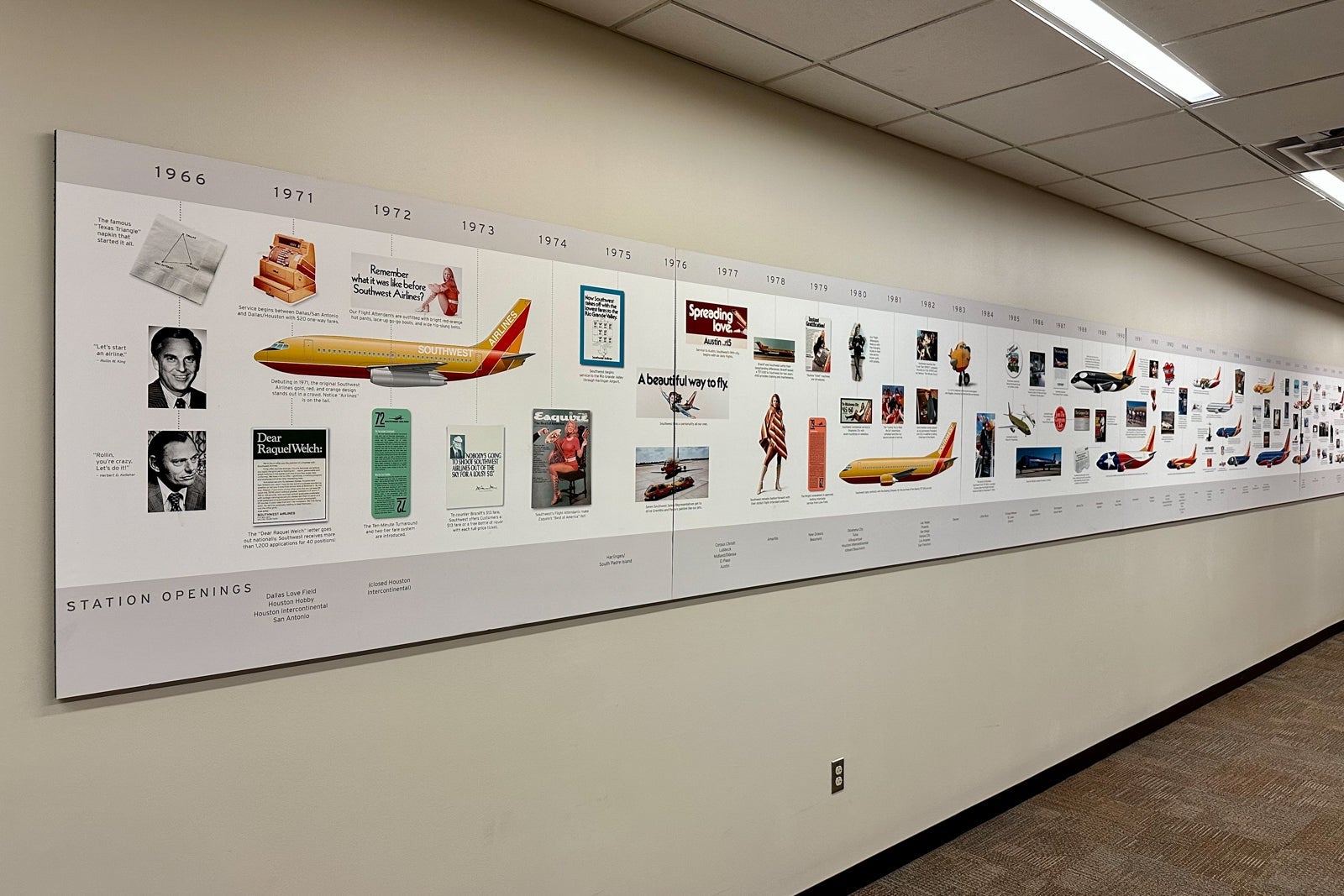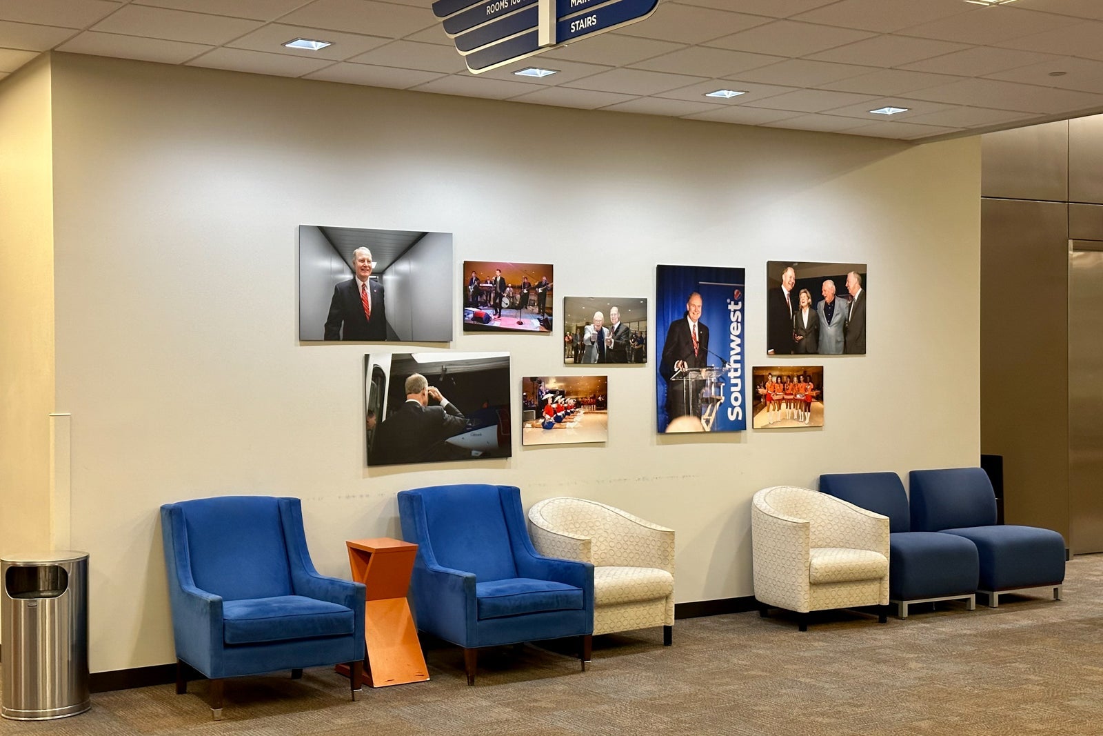 Throughout the building, you'll find nods to Southwest's past, including pictures of founder Herb Kelleher and chairman Gary Kelly, detailed timelines of the airline's 51-year history and old marketing materials.