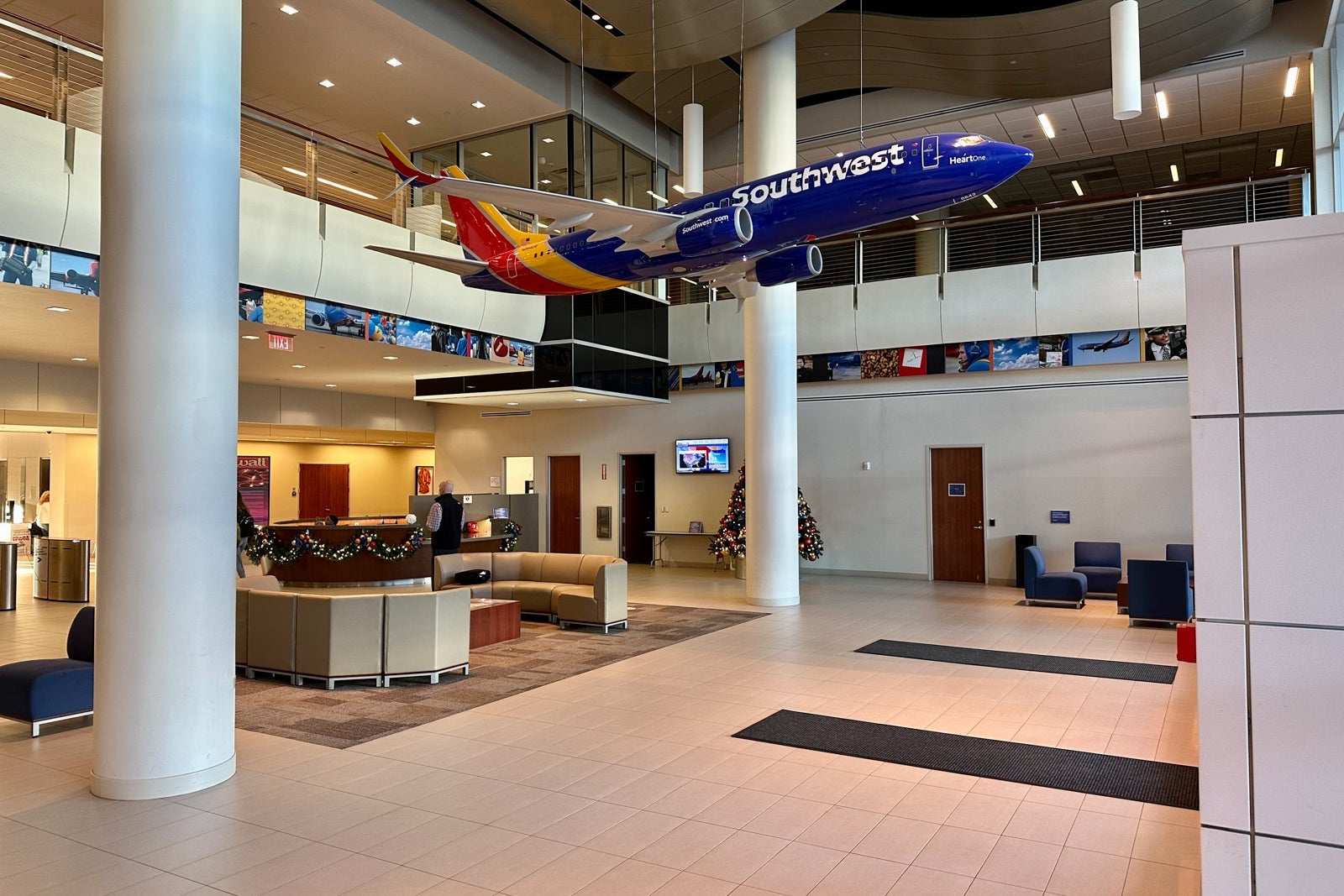 From the moment you step inside, you'll quickly realize you've entered an airline's headquarters — there's a massive Boeing 737 hanging from the ceiling of the main entrance.