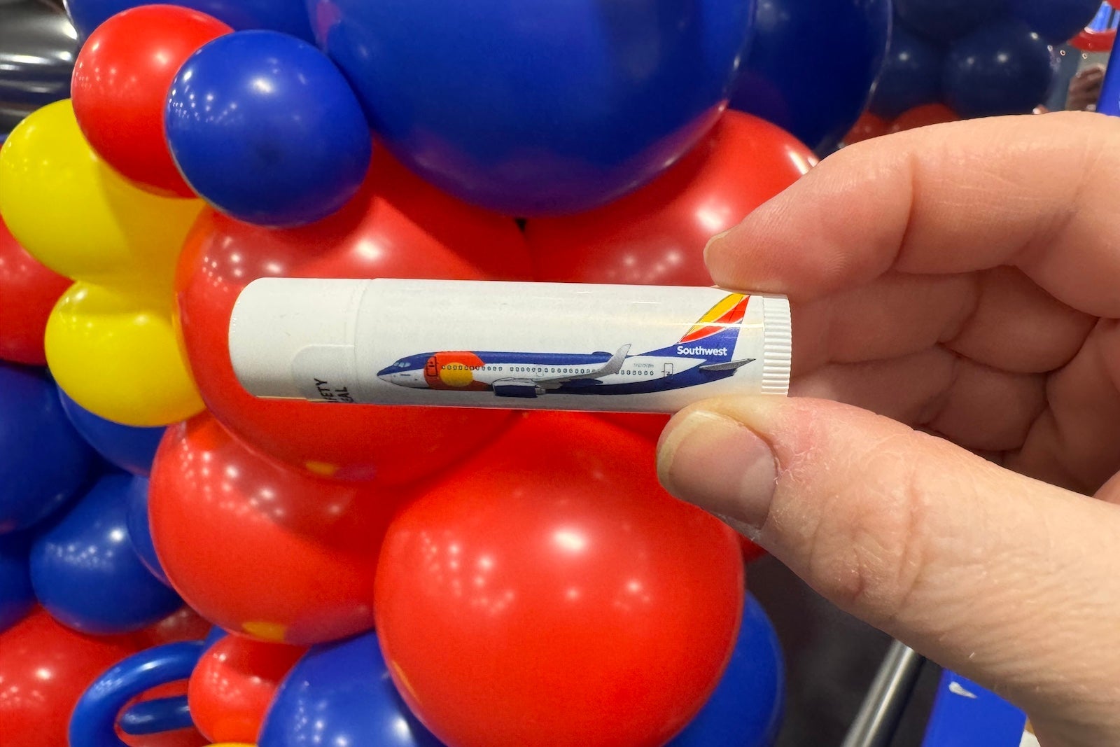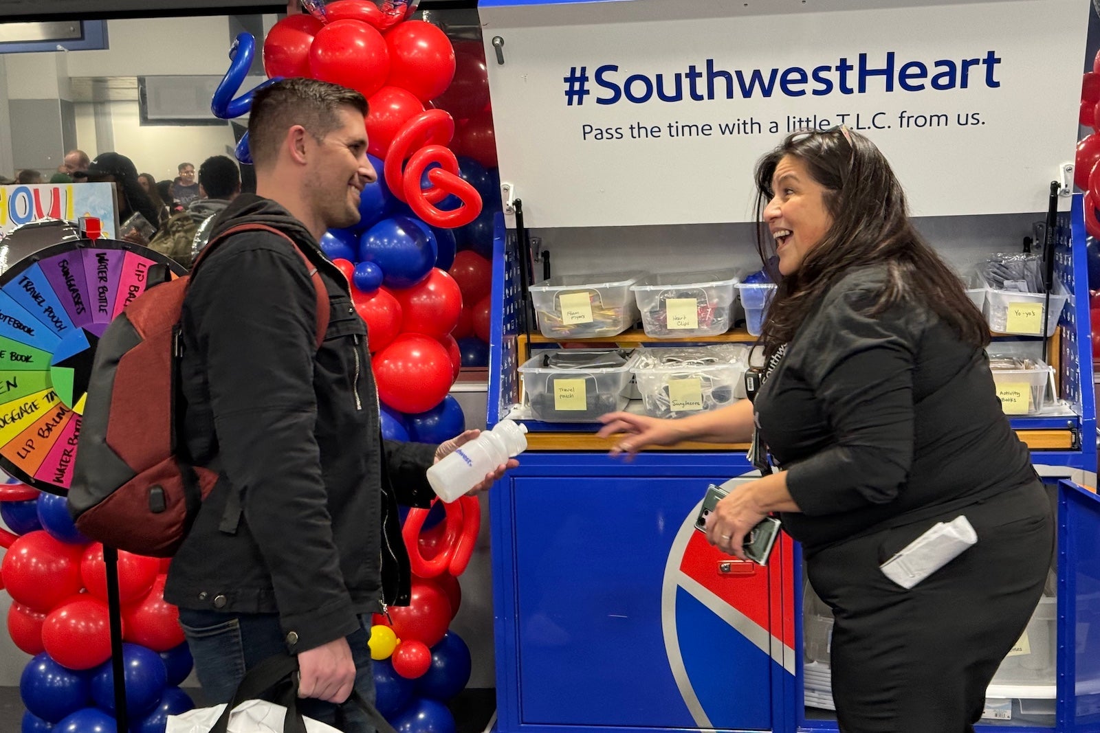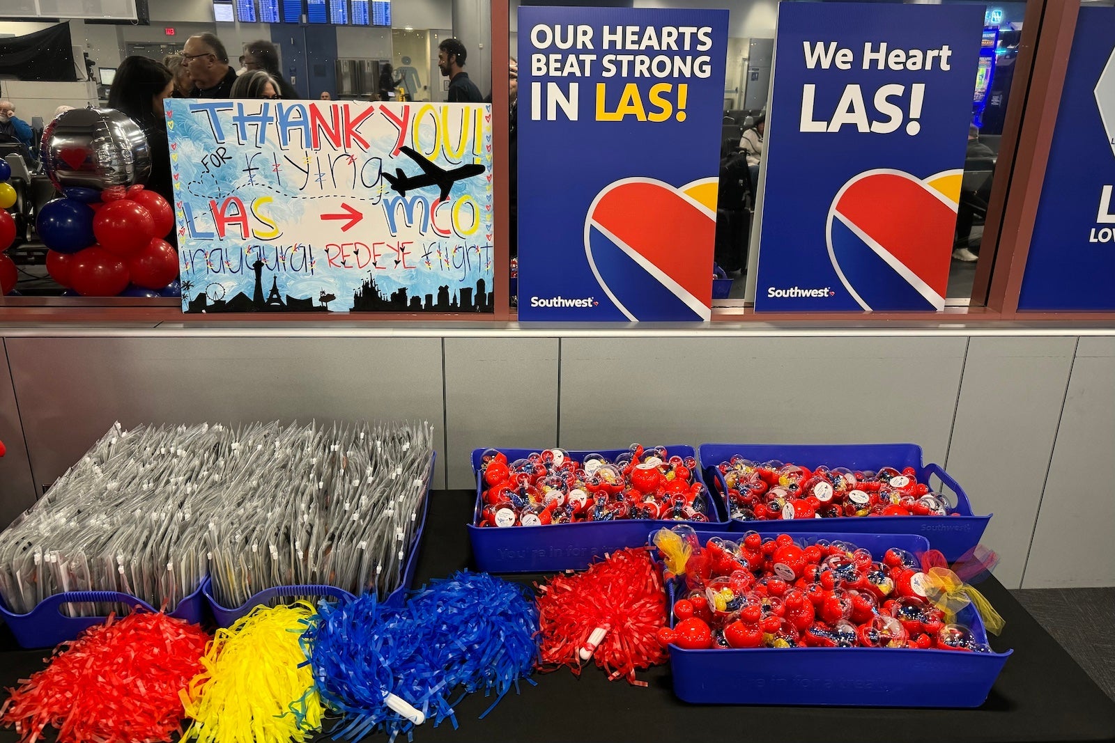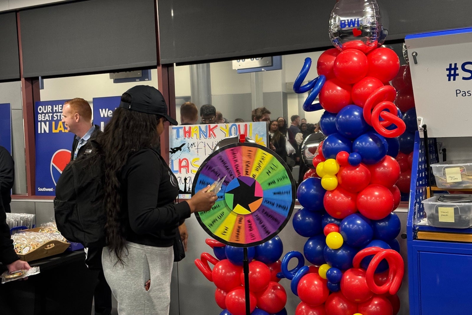 In true Vegas spirit, Southwest customers with a seat on the BWI and Orlando red-eyes lined up to spin a wheel, with prizes consisting of various airline-branded giveaways like luggage tags and water bottles.