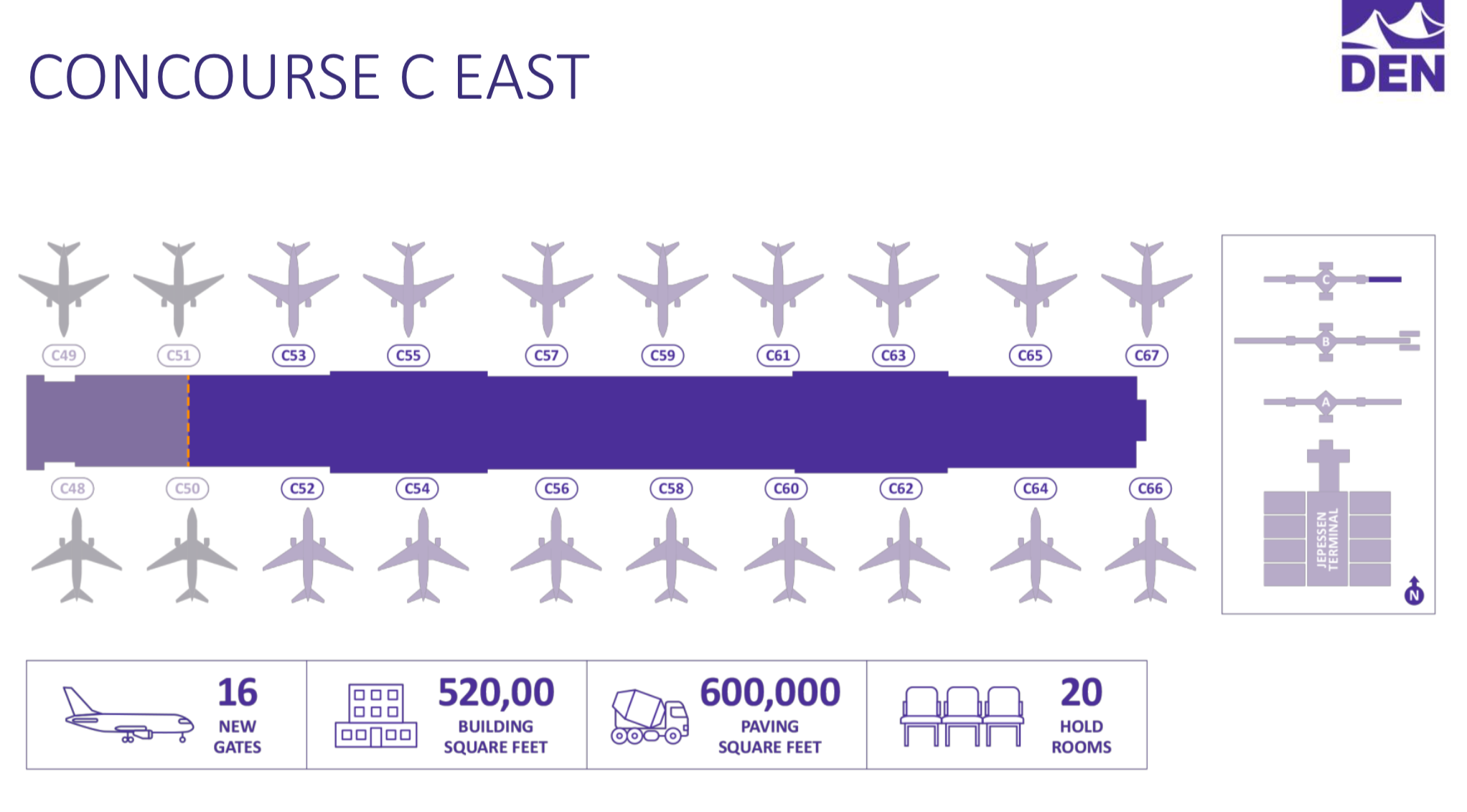 Together, Southwest and United will take all of the 39 new gates that are under construction at Denver airport. The works include new areas for passengers to wait for flights, and outdoor patios on all three of the airport's concourses.