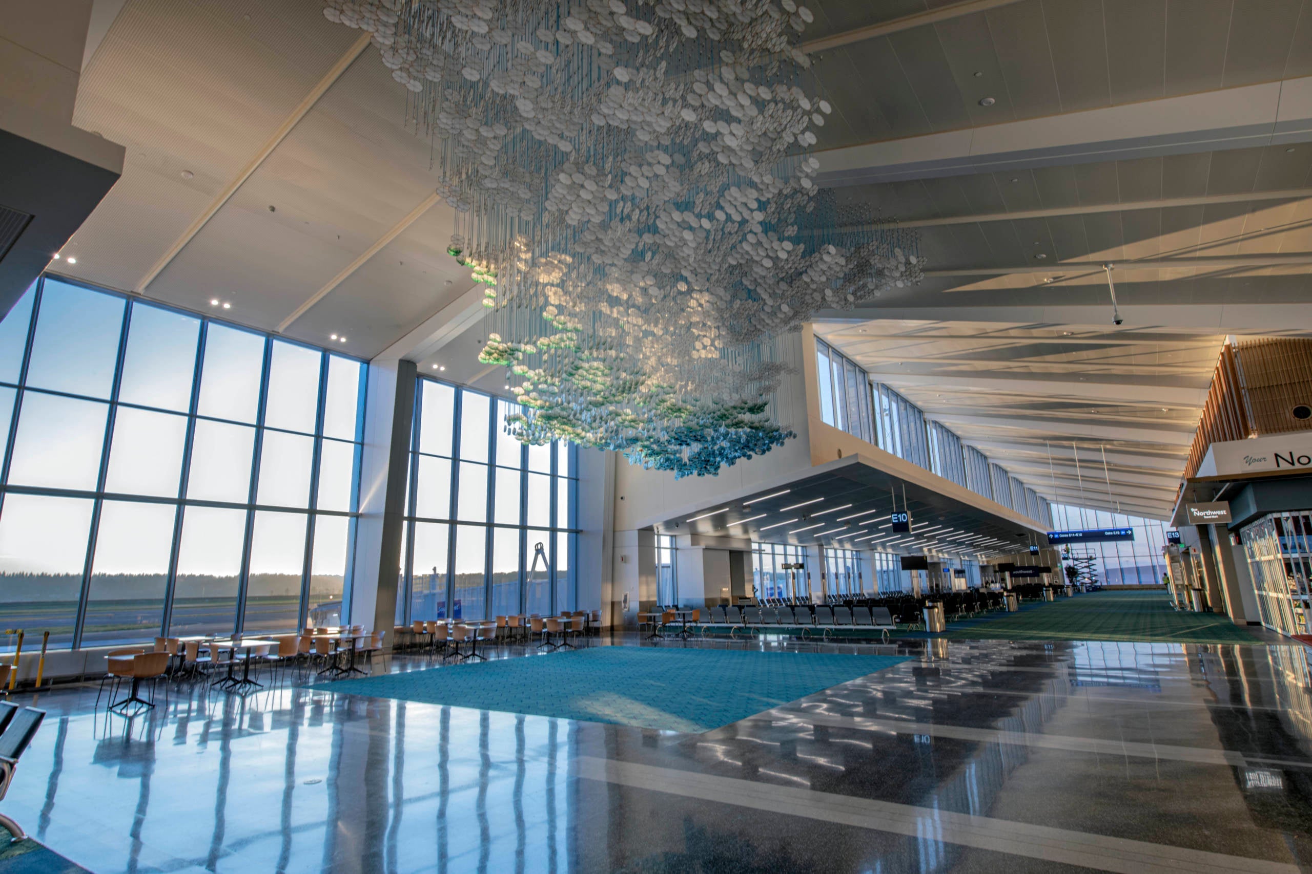 The concourse also features an intricate mobile of kite-like discs by artist Jacob Hashimoto hung from the ceiling.