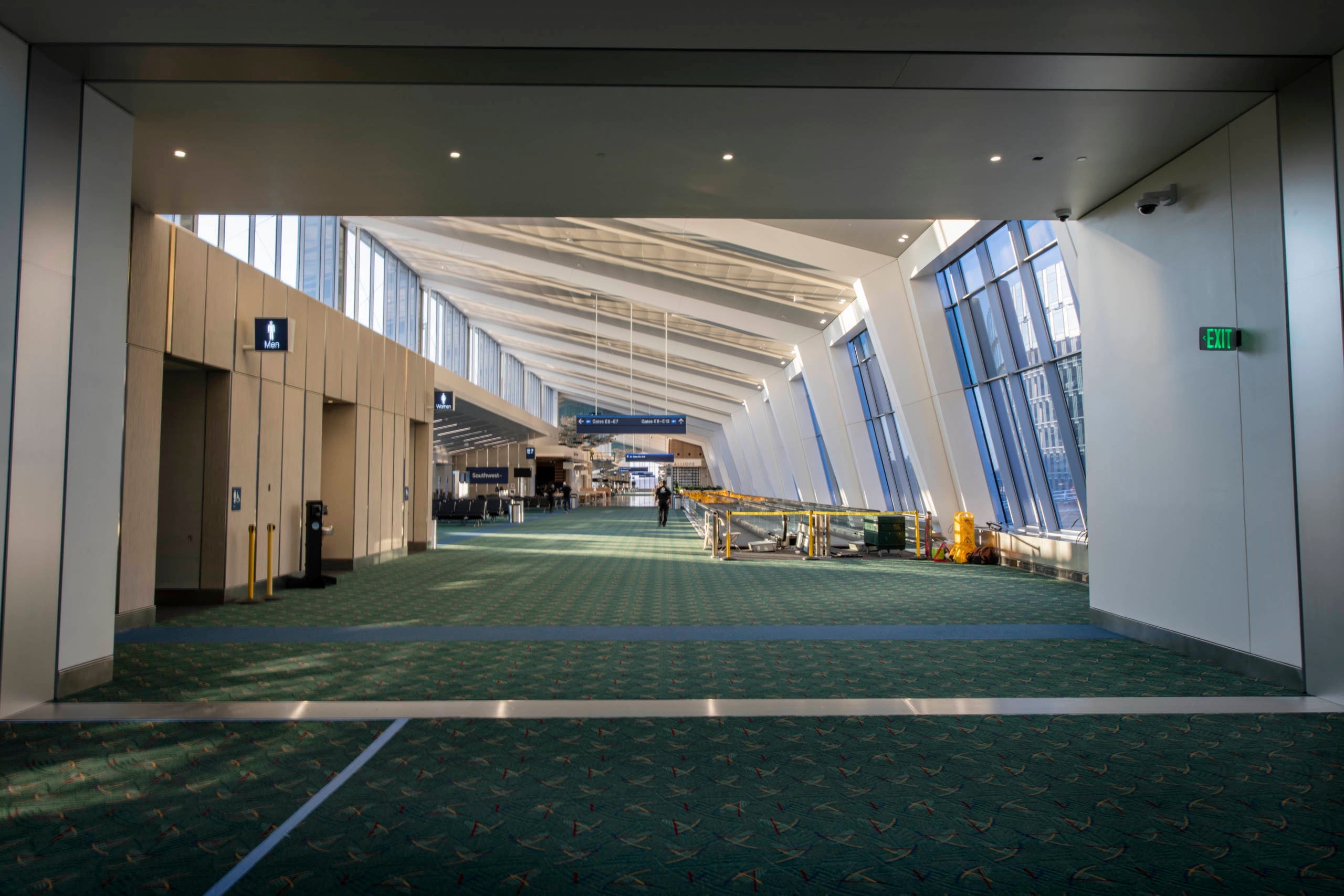 The architects installed moving walkways through the extension to speed the walk to the end. However, due the relatively narrower width of the older section of Concourse E, they could only fit in walkways going one direction — or towards the Mount Hood window.