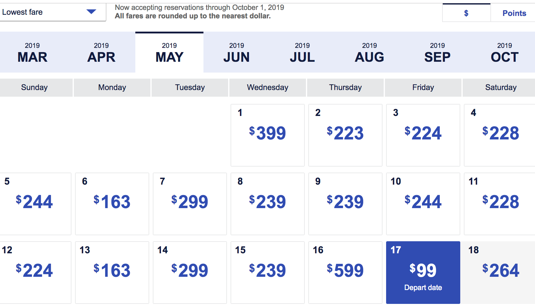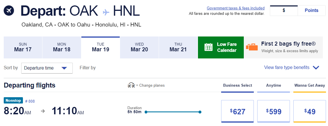 To quickly find the least expensive dates to fly on Southwest, use its flexible date calendar and view the cheapest fares either with cash or Rapid Rewards points. While it isn't $49, flying from California to Hawaii on a variety of dates from about 8,967 Rapid Rewards points (or Chase Ultimate Rewards points transferred instantly 1:1 from the Chase Sapphire Reserve, Chase Sapphire Preferred Card and Ink Business Preferred Credit Card) is still quite impressive.