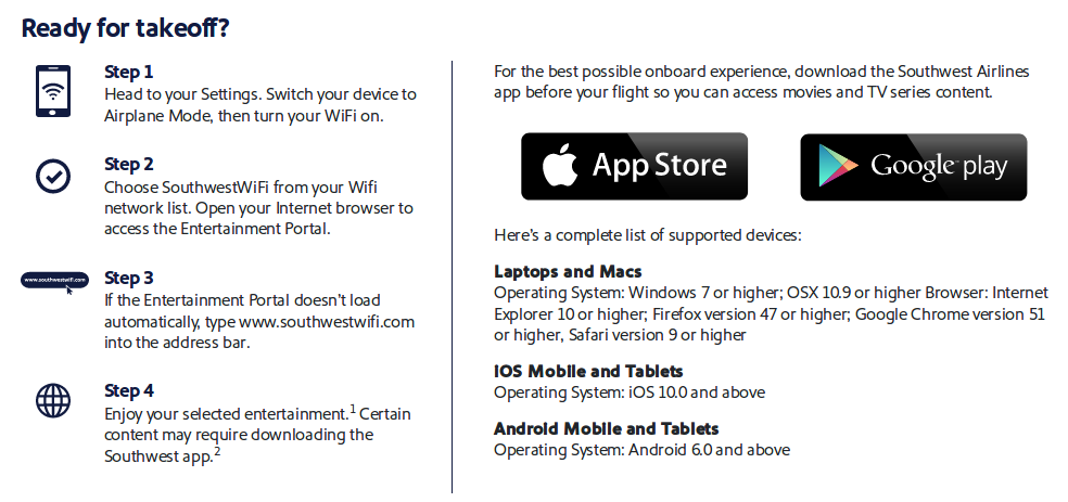 Southwest planes don't offer seat-back screens or power so you'll need to bring your own fully charged device. Also, you'll need to download the Southwest app from the Google Play Store or Apple App Store before your flight if you want to watch movies and select on-demand TV content. Other than that, most in-flight entertainment options are accessible as long as you have a device with Wi-Fi.