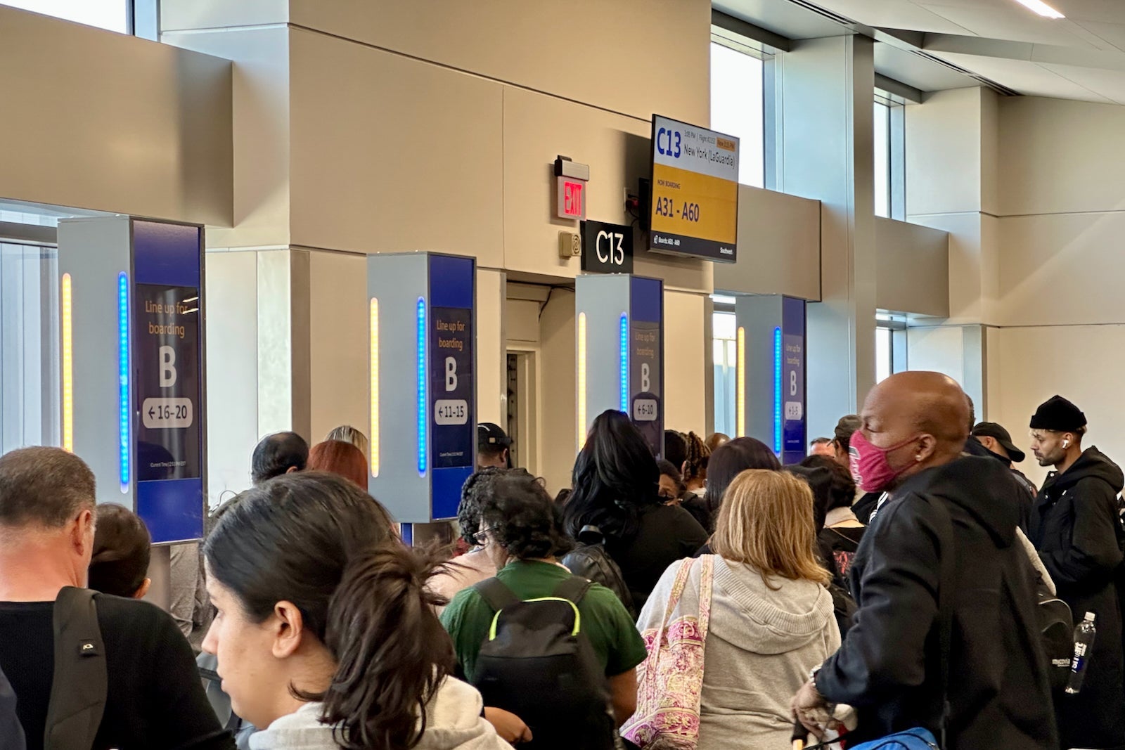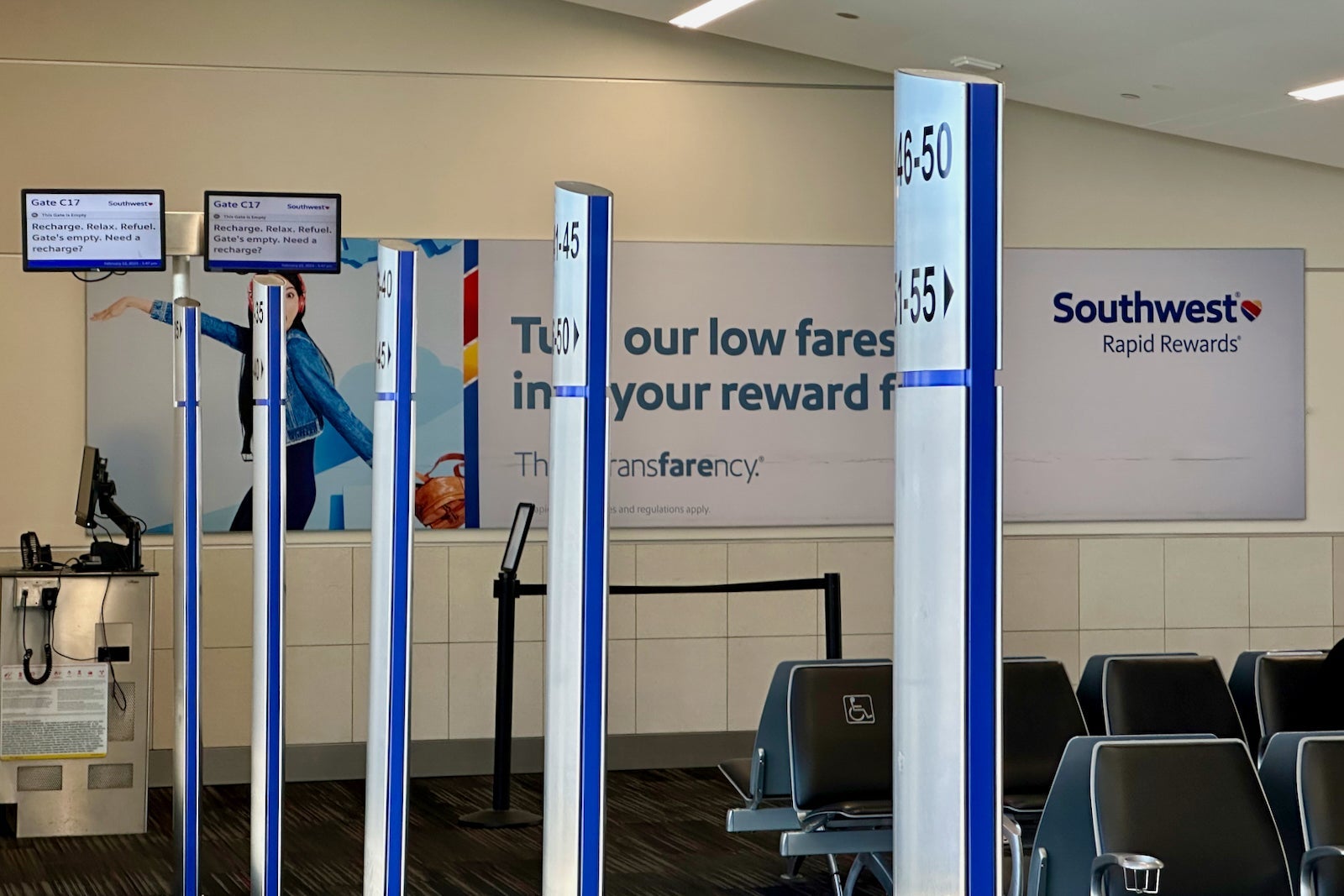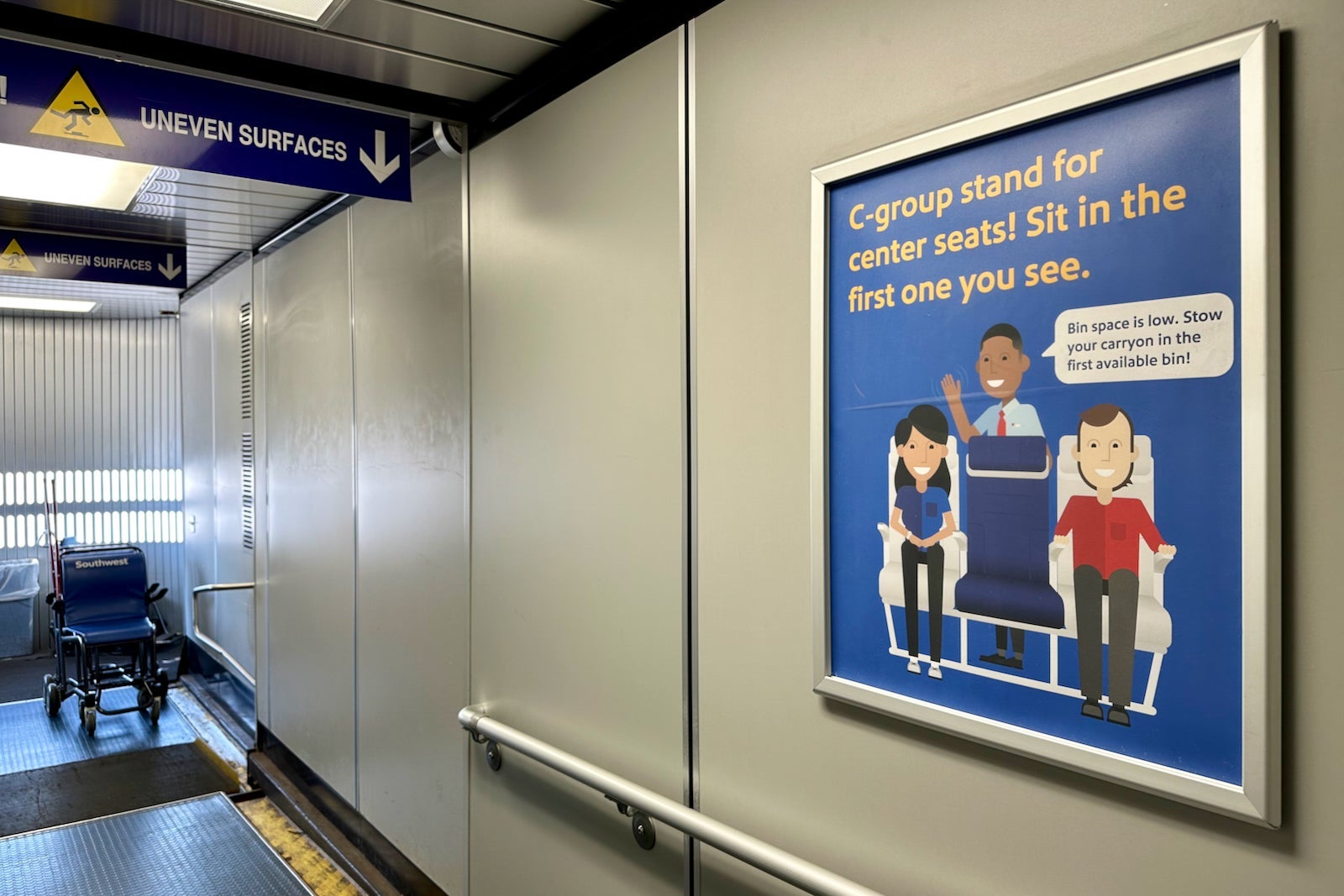Most Southwest gates have metal pillars that show you where to line up when your boarding group is called. However, unless you listen to the announcements, it's hard to know when it's your turn to board.