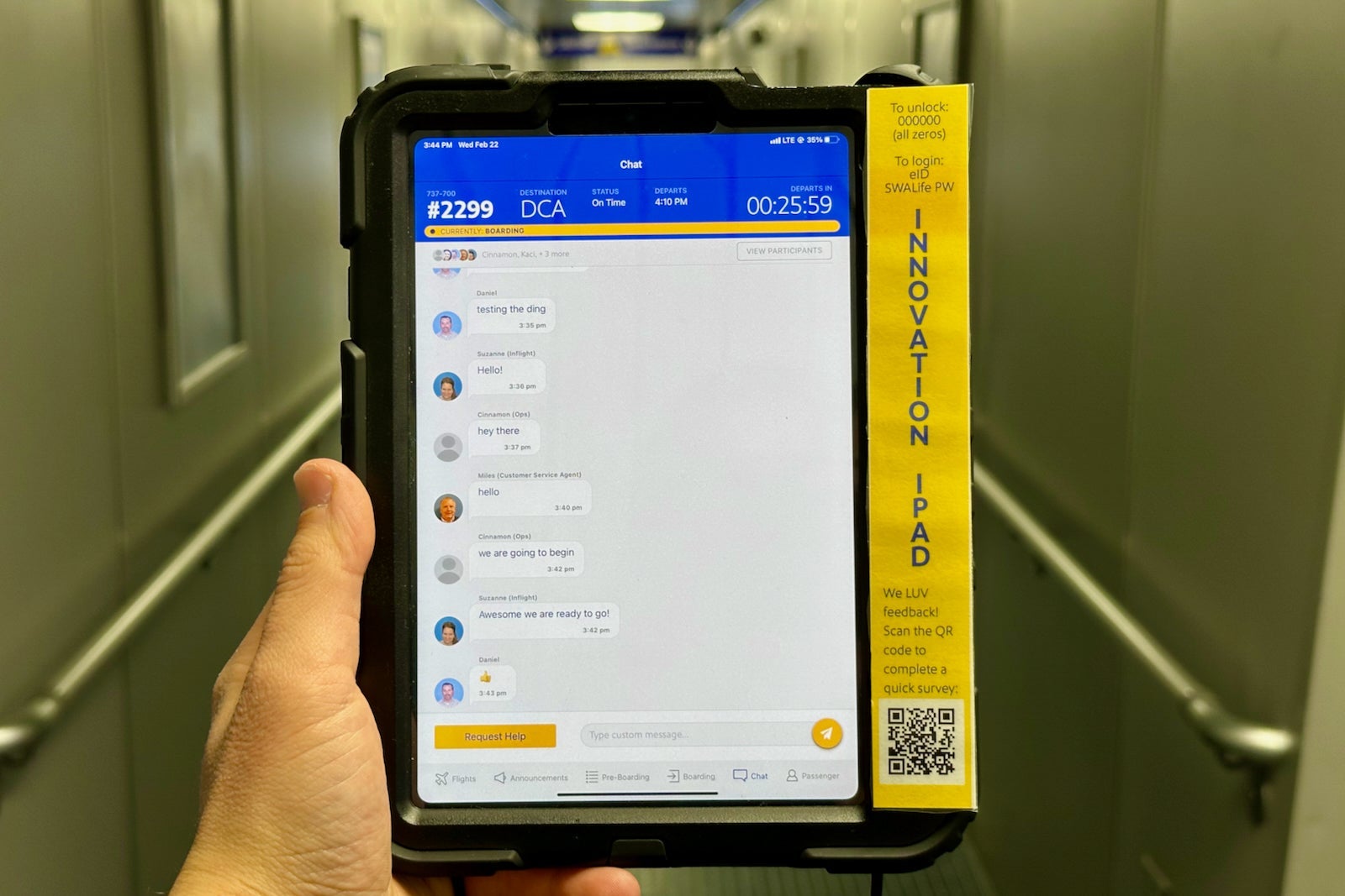 Now, with the new chat feature, the gate agent can wirelessly connect with the flight attendants — saving them time-consuming trips to the plane and hopefully helping speed up the boarding process.