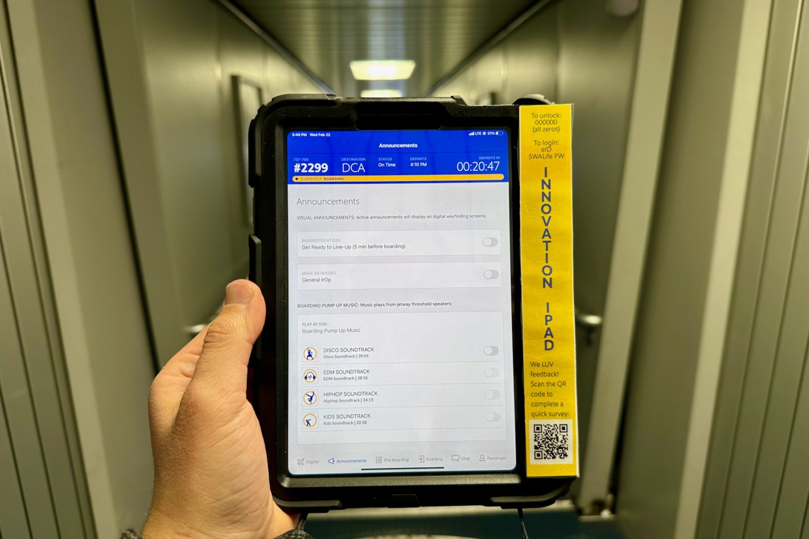 Better yet, the flight crew can also control what's playing on the speakers, so if they are running out of overhead bin space or there are only middle seats left, the crew can play a prerecorded message over the speakers (complete with Southwest's famous "ding" sound) to help manage your expectations for what's happening on board.