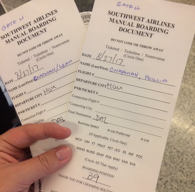 There were some interesting things about this flight. Everything was manual. We received hand written boarding passes on paper and carbon. The took down our names and DOB on a yellow legal pad while standing in line at TSA. They also seemed to have a special system to get everyone's checked luggage where it needed to go (whether staying in Dallas or going elsewhere once safely in Dallas).
