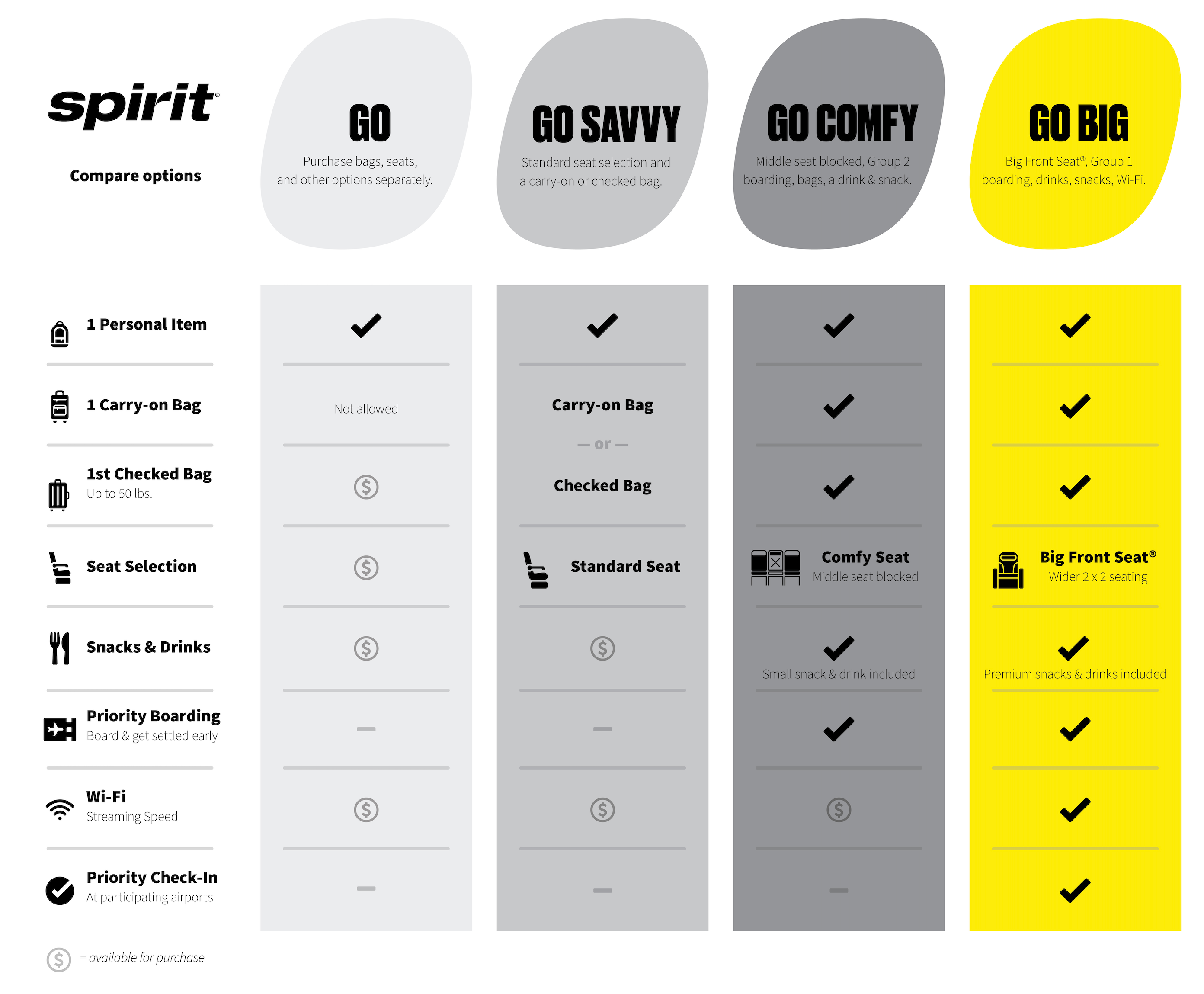 The new fare products include different amenities and ancillaries. The cheapest offering is the Go fare, which largely mimics the existing Spirit experience.