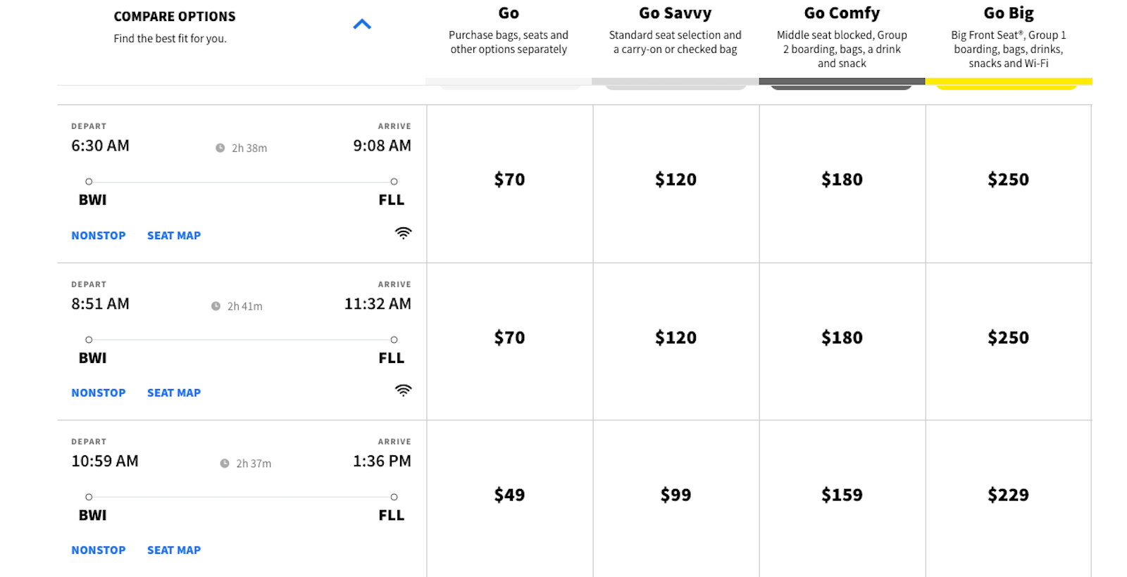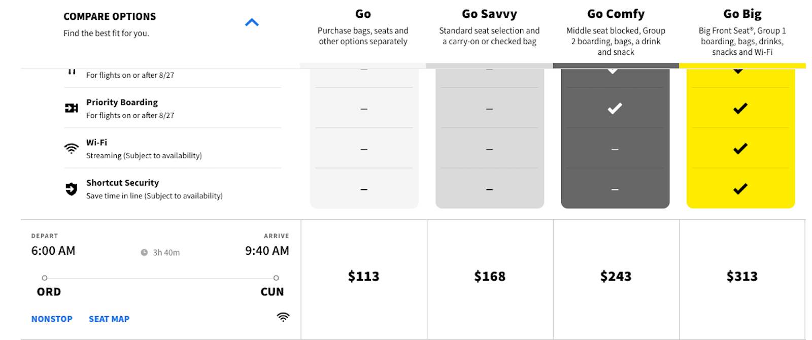 As you can see, the four tiers are featured prominently right at the top of the carrier's booking page.